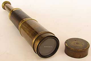 21. 59 TELESCOPE. Extra nice hand-held telescope from the early 1800’s. This unmarked 4-draw telescope is certainly of English manufacture. It has 1 ¾ inch achromatic objective lens in perfect condition, protected by its original press-on lens cover. Together with the original 4 element internal lens system it provides a highly magnified upright image of unparalleled clarity. Speaking to its age (circa 1830) it has the typical “flat” eyepiece with pivoting ocular dust slide characteristic of that era. This telescope is of all brass construction with leather covering which is in exceptionally fine, virtually mint condition. It measures 9 inches long closed and expands to an amazing 30 ¼ inches with a smooth tight action. They really don’t come any nicer than this! 795 |