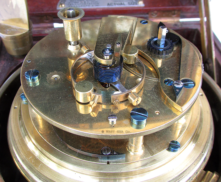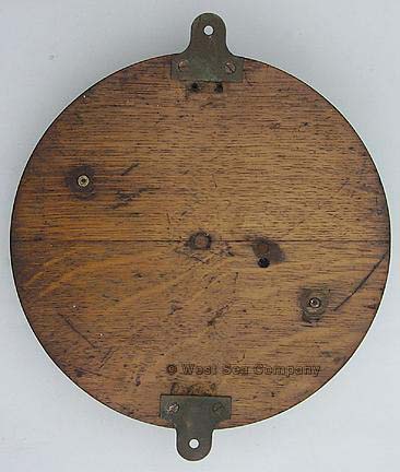 13.05 PATENTED ANEROID BAROMOMETER. Exceptional 19th century barometer of American manufacture, with an open face movement, reverse glass dial and porcelain surround! This magnificent creation is signed PORTLAND INSTRUMENT CO., PORTLAND, ORE. just below the center arbor. The dial is calibrated in inches of mercury from 25.5 to 31.5 divided in 5/100ths increments. It is further decoratively identified with the standard weather indications STORMY, RAIN, CHANGE, FAIR and VERY DRY. The internal porcelain reflector ring is marked PATENT No. 2526 and is dated 1888. The complex, highest quality nickeled movement is entirely visible and operates a blued steel indicator needle overlaid by a brass set needle connected to a small knurled knob rove through the thick beveled glass crystal. The solid brass case measures 7 inches in diameter and is 2 ¼ inches thick. It retains its large pivoting suspension loop at the top for hanging. This instrument is in remarkable original condition in all respects. The interior is perfect. The brass case retains it original bright brass lacquered finish showing good age. Certainly one of the finest barometers of its type we have ever seen. A genuine beauty worthy of the finest collection! Over 120 years old. 995 |