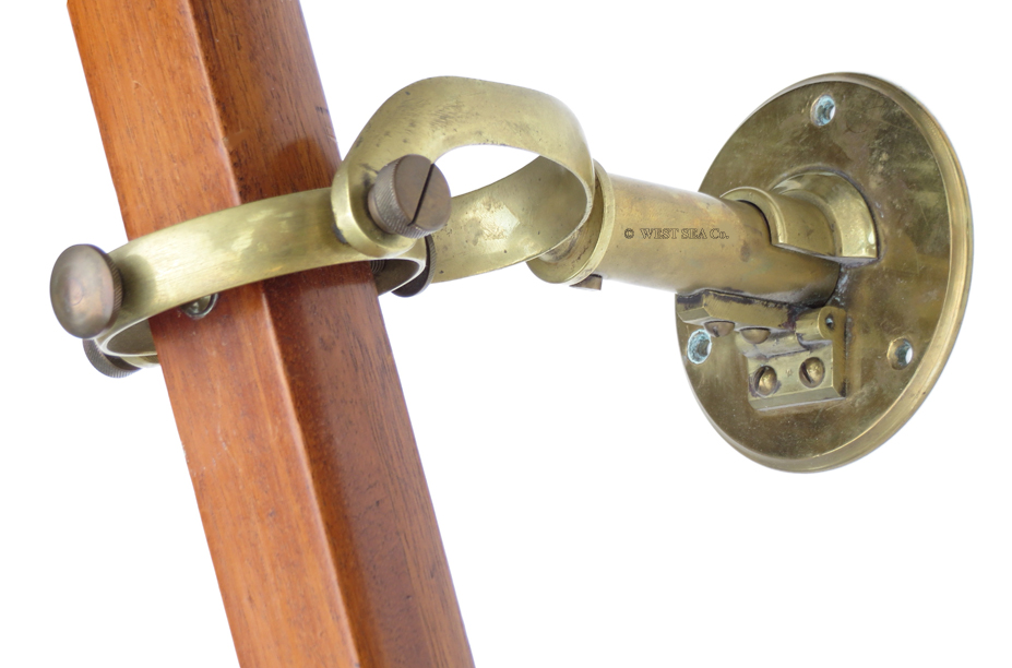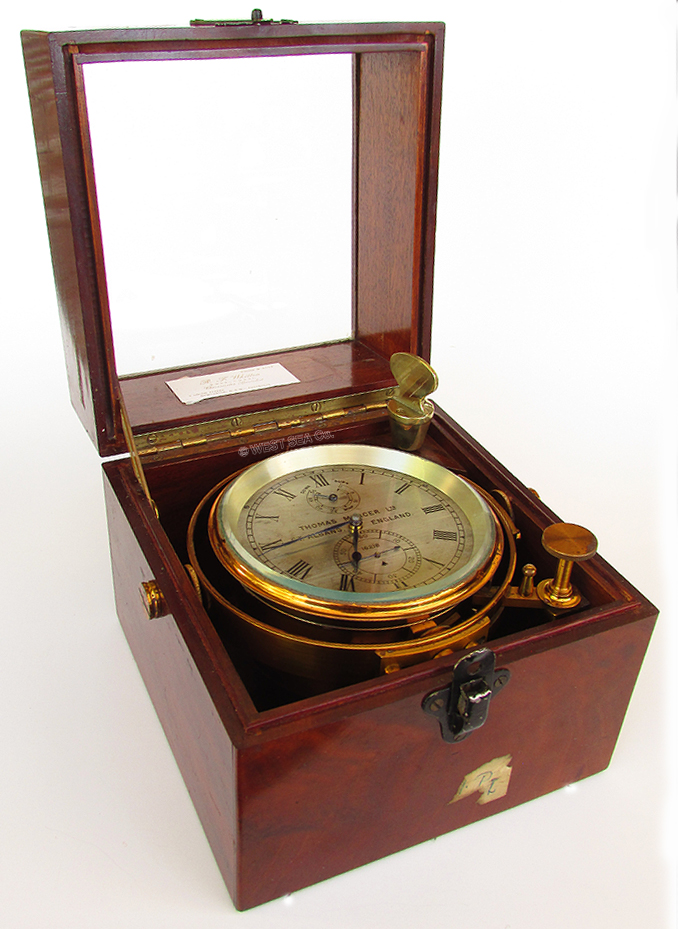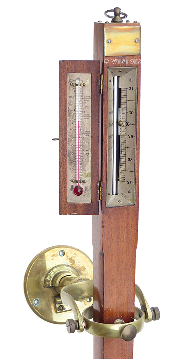 13.29 WEATHER STATION. Precision mid-century West German weather station comprising an aneroid barometer, dial thermometer and hygrometer. These matching instruments are each marked “Lufft, Made In Germany.” The cases are of solid brass and they are mounted on a lovely solid mahogany backboard with a high gloss marine finish. All instruments are functional and accurate. The barometer has a convex glass bezel fitted with a set needle to record barometric pressure changes. The dials measure 4 ¾ inches across each, and measure 5 ¾ inches in diameter overall. The backboard is 22 ¼ inches wide, 8 inches high and 7/8ths inches thick. The edges are slightly beveled for a nice presentation. The back of the backboard is equipped with two high quality inset mounting brackets and there is a hole behind the barometer to allow for setting. A handsome three function weather station in perfect working condition. 495 In the current big screen movie hit, “All Is Lost,” starring Robert Redford, an identical instrument set is seen mounted on the bulkhead of his yacht. |
