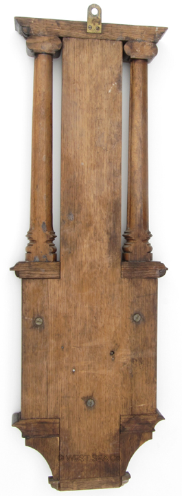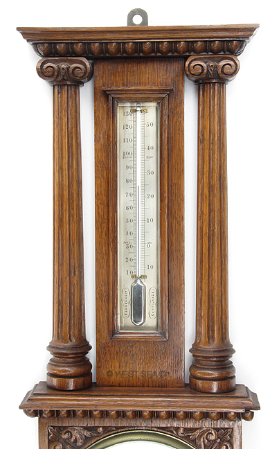 13.22 BAROMETER/THERMOMETER. Especially nice late 19thy century English-made ship’s aneroid barometer with open face and curved mercury thermometer. This precision weather instrument has a white enamel dial with barometric scale reading in inches of mercury from 27.7 to 31.3 in 2/100th increments. It is marked with the standard weather indications “STORMY, Much Rain, Rain CHANGE, Fair, Set Fair and VERY DRY.” Below “CHANGE” a fleur de lis marking the midrange. Indications are made be the slender blued steel needle overlaid by the brass set needle operated by a knurled knob through the bevel glass crystal. Below the open face is the marking “HOLOSTERICE BAROMETER” (form the Greek for “without liquid”). Immediately below is the large curved thermometer reading from 10 degrees to an amazing 170 degrees Fahrenheit. Cleverly, the freezing point is marked with a small arrow. The open dial is a thing of beauty exposing the intricate workings of the complex movement within. The highly polished rose bronze case has a pivoting suspension loop at the top and is equipped with a small orifice on the back for adjusting the reading with a set screw. This pristine instrument measures 5 ¼ inches in diameter and is 2 3/8th inches deep. Fully functional and accurate. One of the best. 749 |