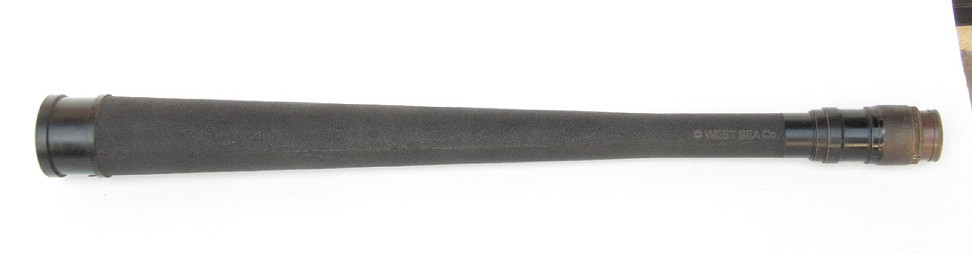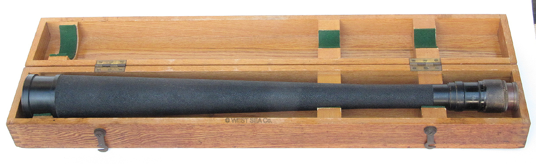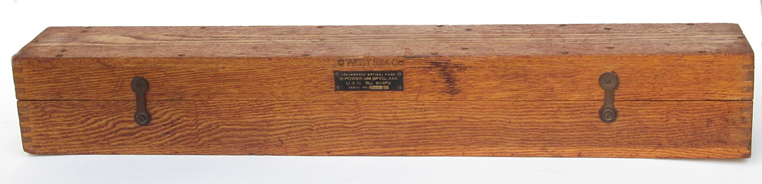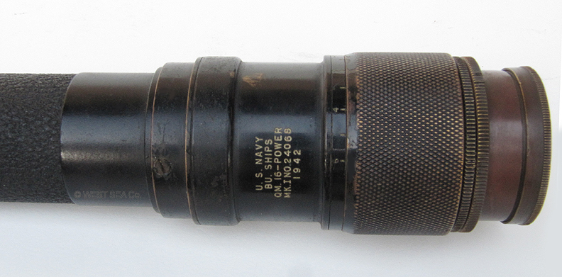 21.74 U.S. NAVY GUNSIGHT TELESCOPE. WWII ship’s telescope used on a U.S. Navy combatant. This solid cast bronze optical instrument is marked on the side, “TELESCOPE MK 78 U.S.N. NO. 2889 INSP. HTM 1943 MINNEAPOLIS HONEYWELL REGULATOR CO.” It is of the prismatic type having a 1 /34 inch objective lens with built-in cross hairs. The all original optics are set for infinity (beyond 30 yards) and produce a highly magnified image of amazing clarity. Above the eyepiece are two knobs. The one on the left is marked “DENSITY KNOB,” presumably for aperture. The knob to the right is marked “RAY FILTER KNOB.” It rotates an inner disc containing 4 filters. They are marked on the body of the telescope, “RED, YELLOW, CLEAR, and POLARIZING” with a small pointer on the knob indicating the respective function. The body of the telescope is additionally marked “MH” in two places and “AIR OUTLET” above a set screw on the right side. The left side is equipped with a mounting plate and a window for a small electric light which has been removed. The base of this instrument consists of a rectangular mounting plate 2 ½ by 4 ½ inches with four mounting holes. The entire instrument measures 6 inches long, 5 inches high by 4 ½ inches wide and weighs 8 pounds. It is in a lovely state of original preservation. The bronze surfaces are bright and free from corrosion. The optics are clear and crisp. A most unusual relic from a World War II capital ship. 395 |