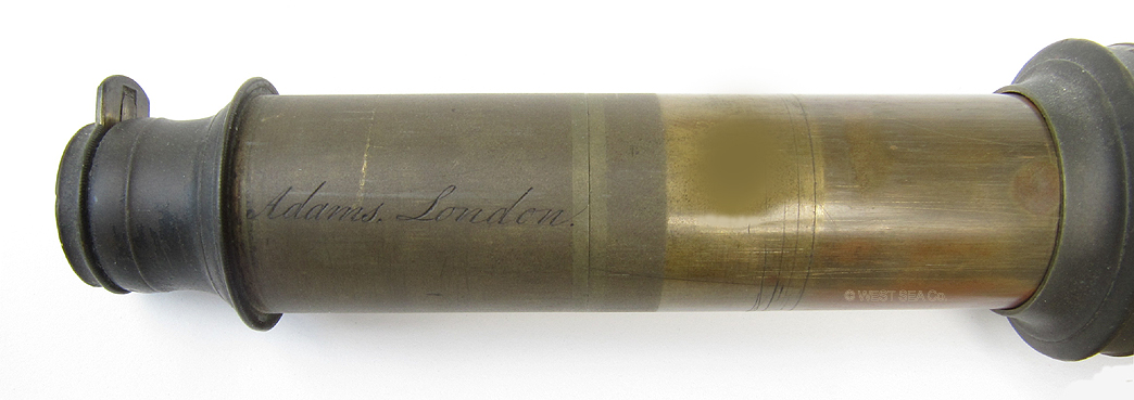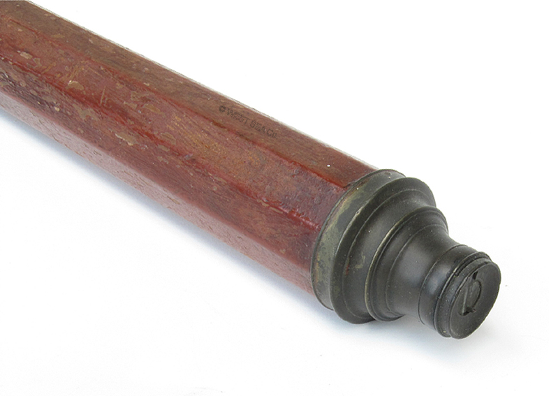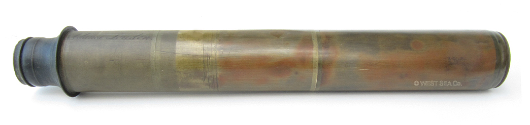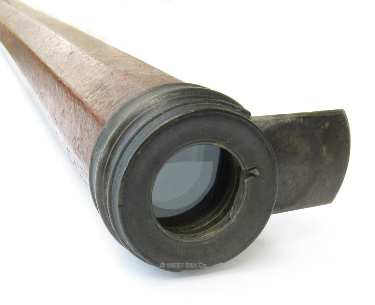 21.77 EARLY 8-SIDED TELESCOPE. Mid-18th century or earlier faceted barrel English telescope commonly referred to as a "decahedral." This particularly fine example of an early mariner’s telescope features a solid body of “flame grained” mahogany with brass fittings. The early form singlet objective is a thin, narrow piece of flint glass contained within a threaded brass receptacle. It is protected by its early form spring-loaded sliding dust cover. Evidencing its early origins, this telescope has only 3 lenses in its erecting system vs. the more common 4 which were standard by the 19th century. In addition, each of the lenses are individually held within there receptacles – a feature indicative of olde English manufacture dating back to the late 1600’s. The eyepiece is of the nipple type also with its original sliding dust cover. This lovely telescope produces a clear, state-of-the-art, highly magnified image for its time, noting it is of the pre-achromatic type. There is a small peripheral crack in the objective lens which does not affect the image. Otherwise condition must be rated as “outstanding.” The barrel itself is in amazing condition with the original finish showing just the right amount of old wear that collectors seek. The brasses are equally fine. 13 ¾ inches closed and 23 ¾ inches fully extended. A rare telescope! 949 Ex. Collection of the Kennebunk Maritime Museum, Kennebunkport, Maine. Peter Dollond was awarded a patent for his non-achromatic lens amidst a flurry of controversy in 1758. Earlier telescopes provided an image slightly distorted by color on the periphery of the field. This telescope is an example of that old type. |