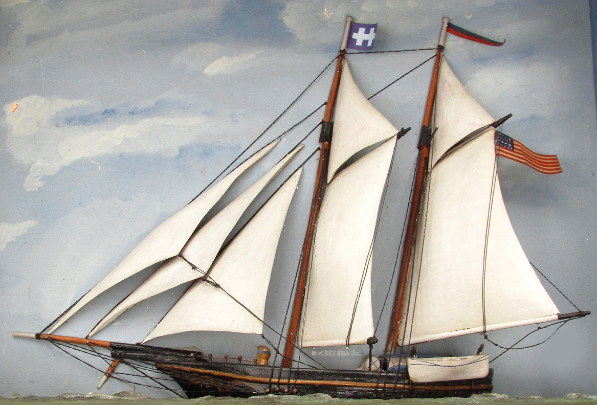 2.96 SILVER MODEL. Delightful, cased model of a gaff-rigged sloop under full sail plying a wavy sea. The model has all 5 sails set and is flying a pennant from the mast. The mains’l shows mast hoops properly rigged. The solid silver hull shows simulated planking surrounding the cabin and cockpit. The helm is realistically portrayed with a classic ship’s wheel. The hull is marked “STERLING 960.” The entire presentation is housed under 5 panels of clear glass within its handsome original rich hardwood frame of pinned construction, The case measures 9 1/8 inches high by 5 inches wide and 8 inches long.. Superb original condition. An ideal gift for that significant yachtsman! WAS $895 NOW only 395 |