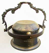 3.62 TELLTALE COMPASS. Third quarter of the 19th century American magnetic compass known as a “telltale” because it allowed the Captain to monitor the course of his ship as steered by helmsman. Also known as an “upside down” compass, this arrangement was designed to be hung from the overhead in the Captain’s cabin observable while seated at his desk or in his bunk. This pristine example has an engraved paper card backed by mica, It is boldly marked with the points of the compass rose down to ½ points and is marked by the Cardinal and Intercardinal points. The north point is designated by a very elaborate fleur-de-lis. The center is signed by the maker “R. MERRILL’S SONS, NEW-YORK.” The card is supported on a jeweled pivot which is rove through the glass face. It is encompassed by a flared brass flange set into the circular compass body supported in gimbals. Of particular note and value this compass is complete with its original ornate hanging bracket with a decorative floral design AND the very rarely found original mount for attachment to the overhead! The diminutive compass flange is 5 ½ inches in diameter and 3 5/8 inches in height. With its suspension bracket it is 8 inches wide and stands 6 3/4 inches high when mounted to the overhead. Outstanding original condition in all respects. Fully functional with no flaws. Just about 150 years old. This example is a gem! 1495 |