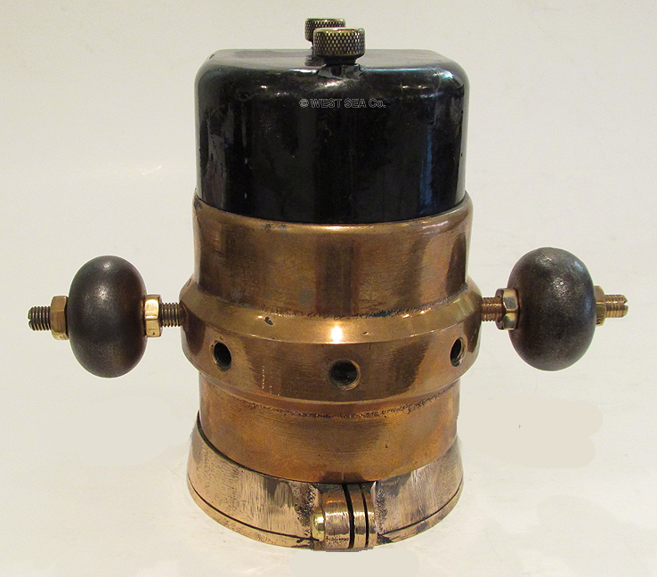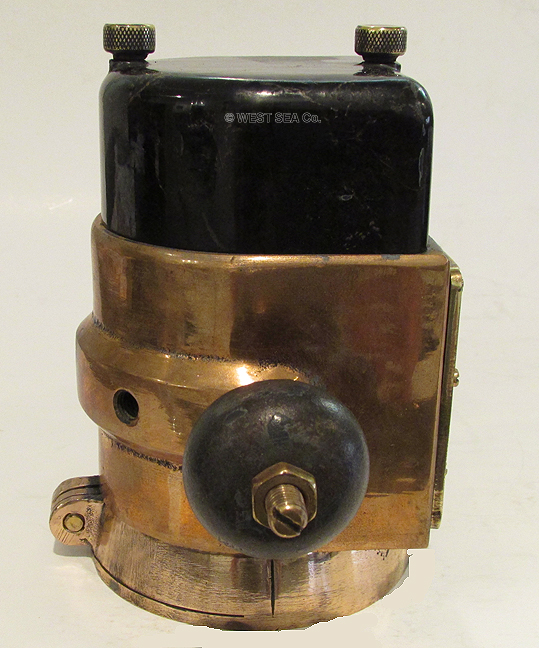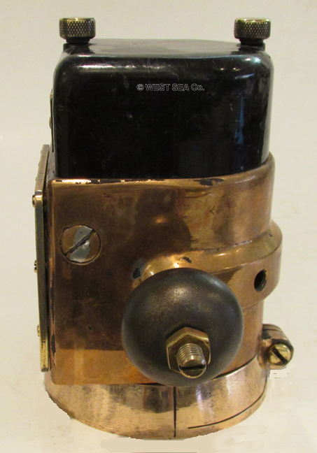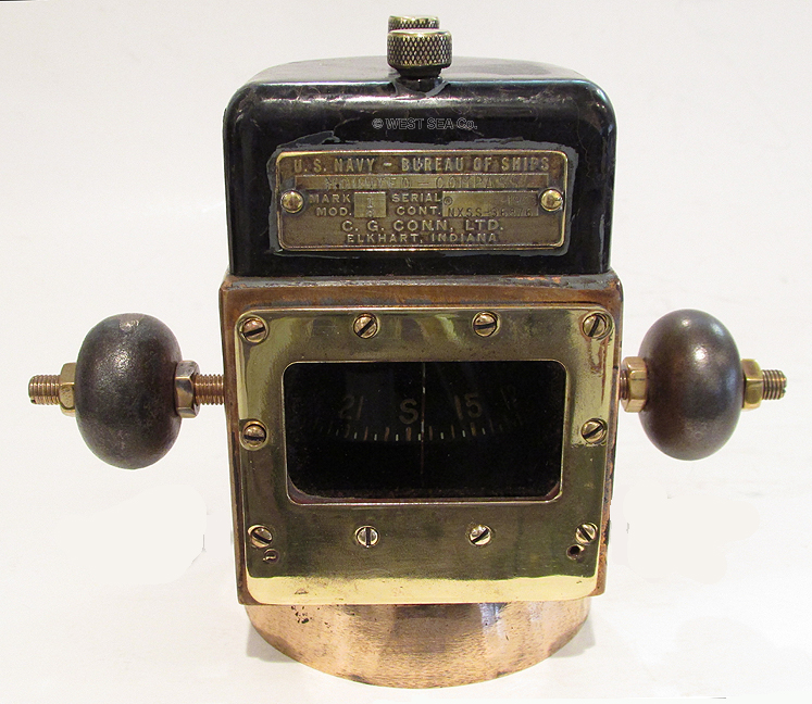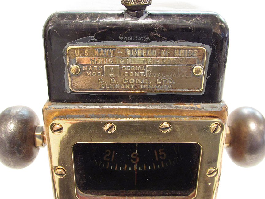 3.53/5.61 WWII NAVY BINNACLE. Genuine World War II binnacle as carried aboard landing craft such as LCU’s and LCVP’S during World War II Naval assault battles including Guadalcanal, Saipan, Iwo Jima, D-Day and Okinawa. The shaped solid bronze body is incredibly heavy for its size, weighing an amazing 7 pounds! This coastal waterways navigational device was mounted on a steel hulled vessel, hence it is flanked by iron compensating balls, just like binnacles on major ocean-going ships. It contains a liquid compass with an unusual horizontal presentation. The dampened card reads in 5 degree increments marked by 30’s with the Cardinal points identified. A thin lubber’s line in front of the card indicates the precise course. The top is capped by a shaped Bakelite cover containing complex magnetic compass correction apparatus. The front bears the brass maker’s plaque reading “U.S. NAVY – BUREAU OF SHIPS MOUNTED COMPASS Mark I Mod 0 (N) 36876” dated “1943, C.G. Conn, Ltd. Elkhart, Indiana.” The binnacle body measures 3 ½ inches wide by 5 ½ inches tall and 4 inches deep. It is 7 ½ inches wide overall. Outstanding, totally original condition with a lovely high luster bronze finish. The compass is lively and accurate. 639 |