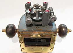 3.42 NAVIGATOR’s RULES. A very nice example of late 19th century rolling parallel rules made by the well-known English maker “J.A. Nicholl & Co.” as impressed in the top of the rule. This substantial, highly accurate navigational instrument is made of brass with a boxwood body. It consists of a heavy brass axel connected to knurled rollers on each end. These move freely allowing the rules to run over the face of a chart parallel to the course line. To assist the navigator in plotting, knurled brass knobs are provided on each end of the rules. This precision device is housed in its high quality mahogany box with machine dovetailing and interior felt supports. Two brass hook and eye closures insure the contents are secure. The rules measure 18 inches long by 2 ½ inches wide. Unlike trapezoidal parallel rulers, the extent of this ruler’s travel is endless. The box measures 19 inches long by 3 ¼ inches wide and 1 7/8 inches thick. Outstanding original condition in all respects. 249 |