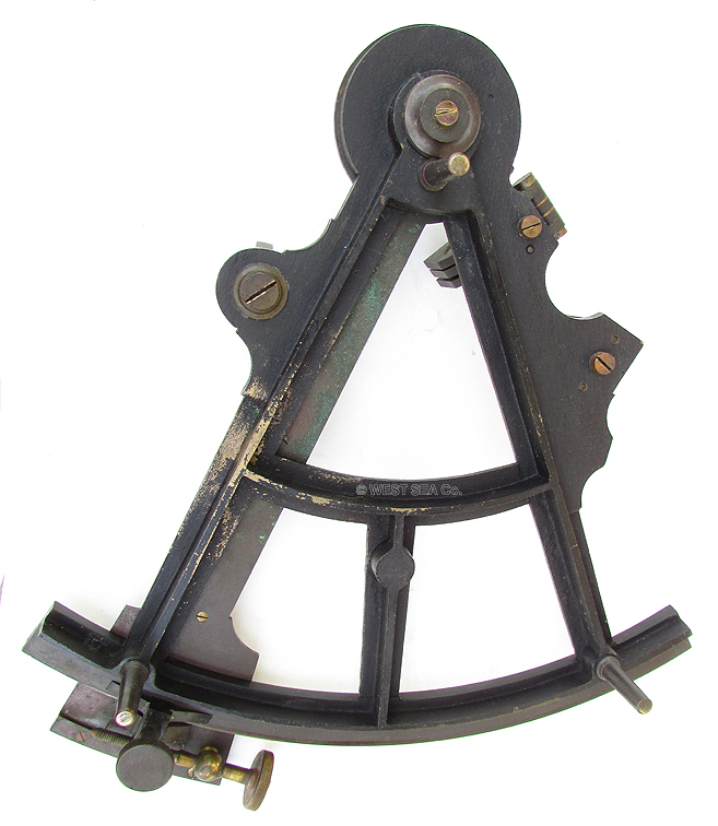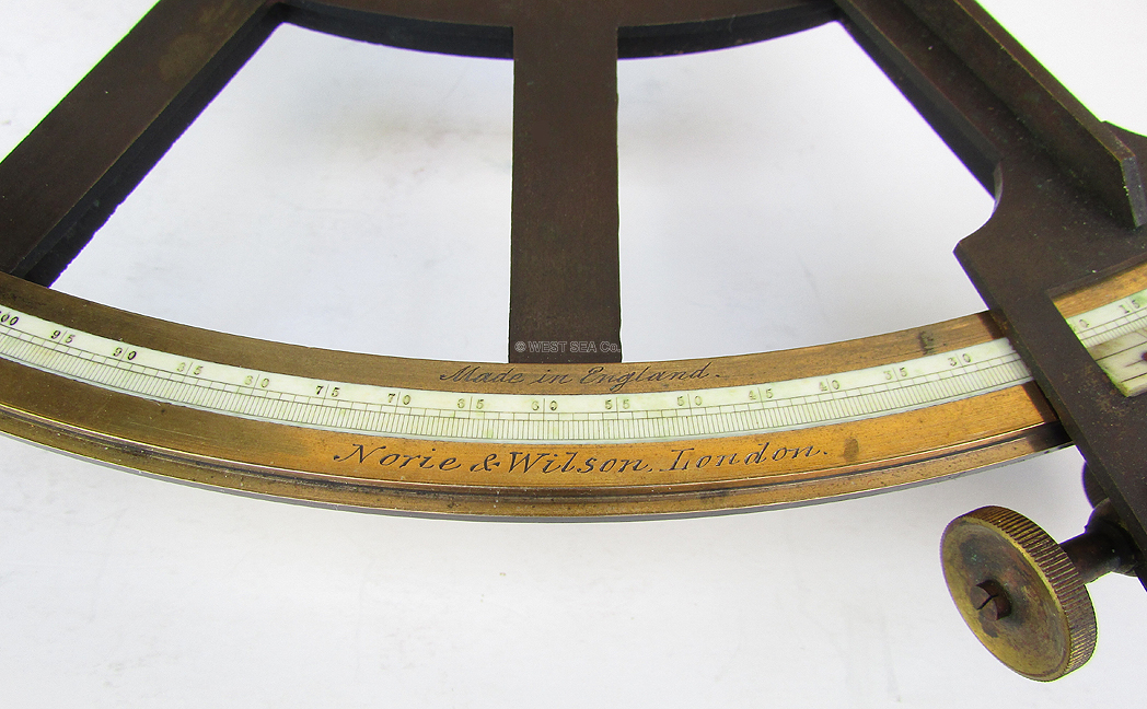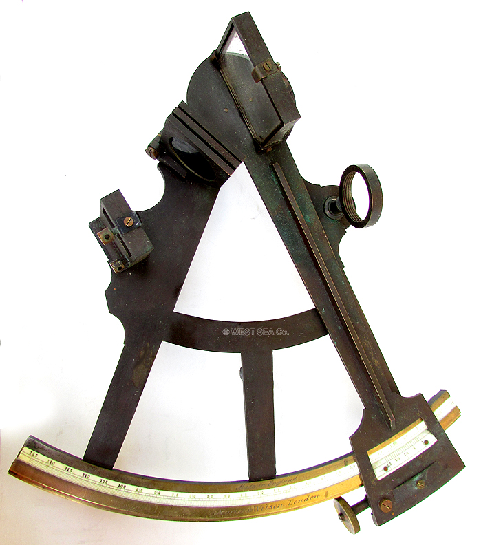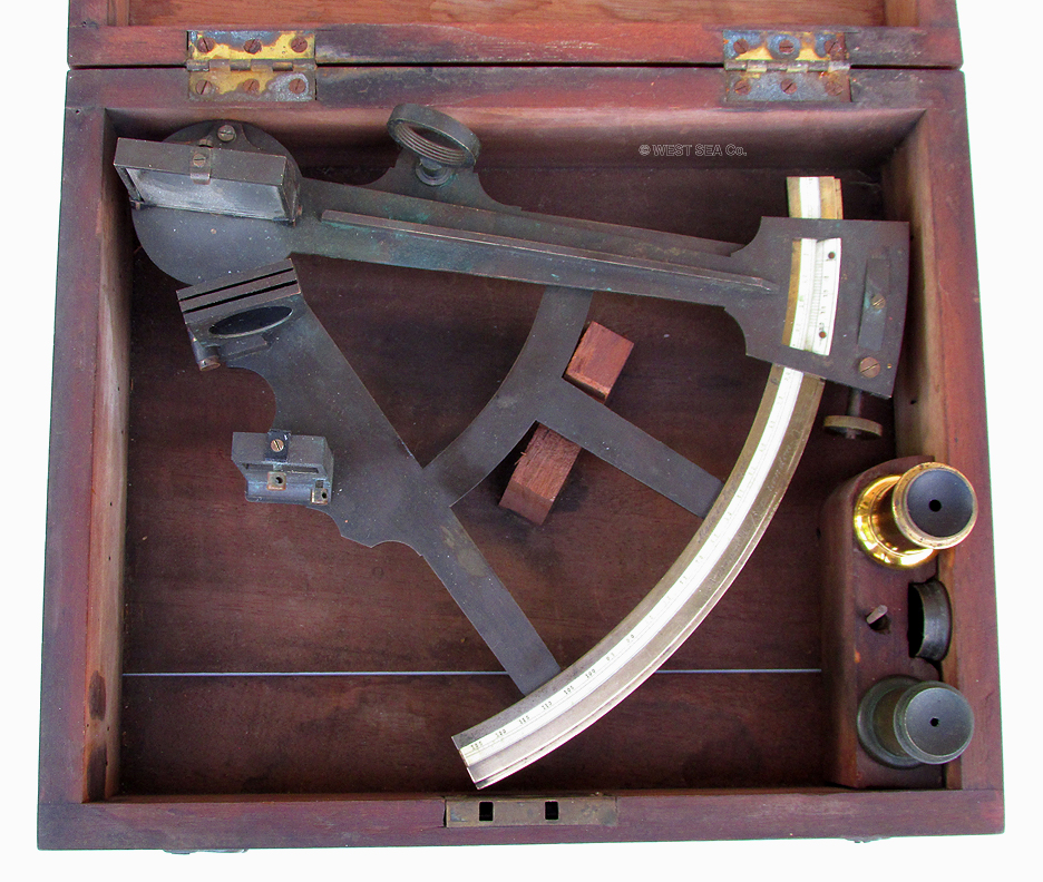 GAS PRICE SPECIAL! 3.79 VERY OLD 1800’s SEXTANT. Very nice especially early 19th century mariner’s octant/sextant of English manufacture. This unusual all brass instrument has a lovely solid ivory scale inlaid into the large arc. It is signed “Norie & Wilson, London.” additionally marked “Made in England .” The scale is calibrated in single degrees from -5 to 125 subdivided by 20 arc minutes and marked every 5 degrees. The ivory vernier scale on the index arm is marked from 0 to 20, allowing a reading of one arc minute. The arm has a knurled thumbscrew stop and an endless tangent screw for fine adjustment. The instrument is complete with both index and horizon mirrors and a full set of pivoting index filters. A simple threaded eyepiece holder accommodates the two sighting tubes in the box. An additional screw-on sun filter is also present. The original rectangular mahogany box has its lock and striker plate as well as both brass hook and eye closures. The prominent label of “S Thaxter & Son, Boston” is inside the lid. The index arm measures 9 ½ inches long and the arc is 9 inches wide. Outstanding, untouched original condition. The box is 9 ¼ by 11 inches and is 3 ¾ inches thick. There is a significant age crack in the lid which does not interfere with the integrity or function of the presentation. WAS $995 NOW! 295 |