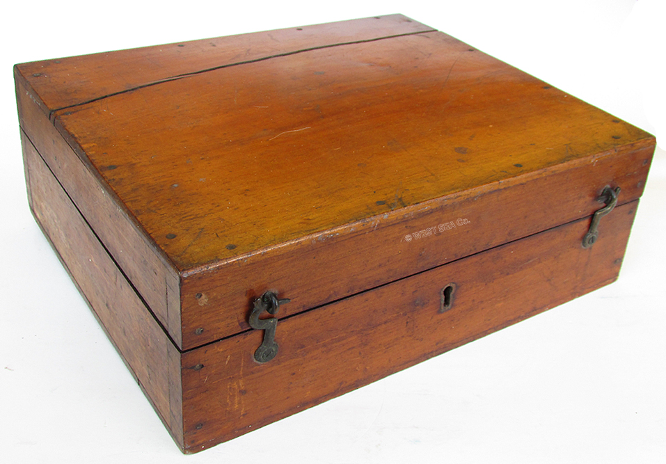 3.66 MARINER’s OCTANT. Especially nice mid-19th century navigational octant of English manufacture. This exceptionally-well preserved example has the ivory maker’s plaque on the center strut engraved “H. SYRED 166. PARK LANE. LIVERPOOL.” This pristine example is a collector’s dream. It is in virtually the same condition as it was made over 150 years ago! It is complete with all of its functioning brass parts. The large ivory scale is calibrated in single degrees from -2 to 100 divided by 20 arc minutes marked in 5 degree increments. The ivory vernier on the index arm is calibrated right to left in single minutes from 0 to 20. This state of the art for its time navigational instrument has a braced brass index arm with knurled brass stop and an endless tangent fine adjust knob. Up to this time only the finest high-quality sextant shad these features. This instrument is complete with both index and horizon mirrors, 3 pivoting index filters and 2 rotating horizon filters. Again, this latter feature is indicative of the octant’s quality. The sighting peep has two openings with a pivoting brass shutter. The back of the instrument has the mirror box adjustment apparatus and all 3 brass “feet” for positioning in its box. The box itself is noteworthy. It is of the early “keystone” type with 2 hook and eye closures. What is unique is that it has a very nice folding carrying handle and it is complete with its original skeleton lock and striker plate. The index arm measures 11 ¾ inches long and the large arc is 9 ¾ inches wide. The box is 12 ½ inches long by 11 ½ inches wide. The quality and overall condition cannot be overstated. It is virtually perfect in all respects! A $1500 value. 799 |