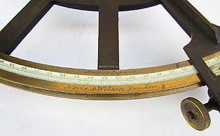 3.68 EARLY MARINER’s QUADRANT. Here is a very special example of a late 18th or turn-of-the-19th century navigational instrument by one of England’s foremost makers. The ivory maker’s plaque is engraved “Spencer Browning & Rust London.” This classic double reflecting instrument, later known as an “octant,” has an ebony wooden frame with brass furniture and ivory scales. The large ivory arc is divided in single degrees from -2 to 99, marked by 5’s, subdivided in 20 minute increments. The scale was calibrated on the firm’s famous 18th century dividing engine as indicated by “SBR” stamped at its mid-point. The flat brass index arm is fitted with an ivory vernier scale reading from 0 to 20 arc minutes right to left. This afforded the observer a reading with an accuracy of about 1 minute (one nautical mile). Innovators that they were, SBR incorporated a positive stop on the back of the arm coupled with a fine adjust tangent screw. This advancement was later incorporated in all such angle measuring devices well into the 20th century! Of great significance to its value, this quadrant is engraved with the Captain’s name in script on the index arm. It reads “Jacob Drummond.” This instrument has both index and horizon mirrors and all 3 index filters. The peep sight is of early form with two apertures and an unusual circular pivoting shutter. Also attesting to its early age is the vestigial back sight with mirror. That feature became obsolete and was no longer used by 1820. But in keeping with its early style, the index filters are replaceable for either the foresight or backsight functions. The back of the instrument is totally complete. It has notable features: The mirror box is adjustable with a knurled knob allowing for a much finer adjustment than earlier “ butterfly” hand adjustments (which it still has for its out-dated backsight)! There are 3 brass “feet” for positioning in its box and an ivory note pad for recording readings. To these ends, it retains its rarely-found ivory pencil within the cross brace. This instrument is housed in its original stepped keystone case. The case adds significantly to the value of this offering. Firstly, it is made of very dense African mahogany of the finest quality. Secondly, the construction is with fine, hand-fitted dovetails. Thirdly, the box has a very unusual internal mount which securely holds the instrument in place. Fourthly, the case has very decorative serpentine extensions reinforcing the box. We have not encountered this exceptional detail in our 45+ years in the business. The box is complete with both hook and eye closures. Lastly, there is the very decorative later servicing label of “Thomas Hemesley11 Kings Street, Tower Hill, London” in the lid depicting early navigational instruments of the era. The quadrant measures 14 inches long on the index and 11 ¼ inches wide. The box is 15 ¼ inches long by 13 ¾ inches wide and is 4 inches thick. Overall condition is outstanding all respects, considering this instrument is at least 225 years old! 1600 According to M.V. Brewington, curator of the Peabody Museum, Salem, Massachusetts and author of the reference book “The Peabody Museum Collection of Navigating Instruments” 1963, “There are more extant instruments by this firm than any other. It would appear that the firm sold wholesale to dealers all over England and America. The firm first appears in the London Directories in 1780 and High Street, Wapping , London. In 1843 the name was changed to Spencer, Browning & Co.” Thomas Hemsley II worked as an optician, mathematical instrument maker and nautical instrument maker at Sing Street, Tower Hill, London beginning in 1828. (Gloria Clifton, “Directory of British Scientific Instrument Maker 1550 – 1851”, 1995, The National Maritime Museum, and Zwemmer, Philip Wilson Publishers.) |