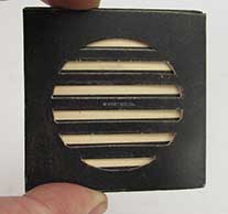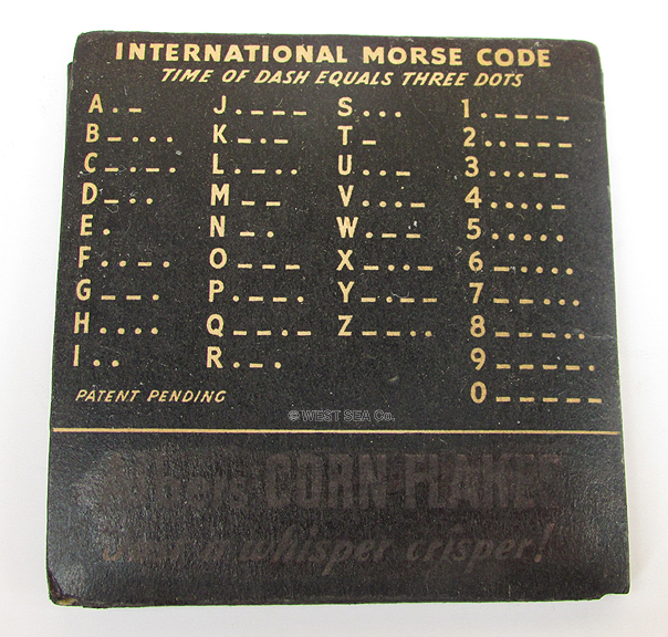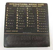 5.82 SIGNALMAN’s TRAINING DEVICE. World War II or earlier hand-held teaching aid for training Navy signalmen to send Morse Code using flashing light. This ingenious device is made of stiff cardboard with louvers simulating a signal light for transmitting “INTERNATIONAL MORSE CODE” as indicated on the back. All 26 letters of the alphabet and numbers 0 - 9 are indicated with their corresponding code. The front is marked “PRESS DOWN… MAKE BACK BULGE,” cleverly simulating the emission of light. The back is marked “Patent Pending.” 2 ½ by 2 5/8 inches. Outstanding original condition. A rare, fragile survivor in working condition. 25 |