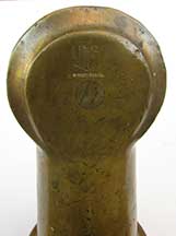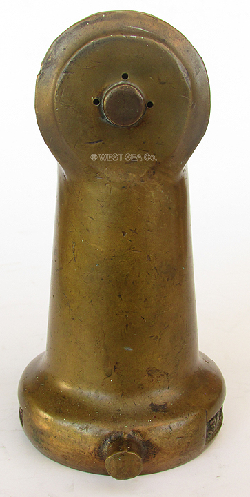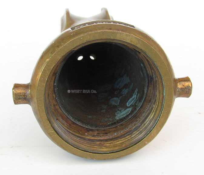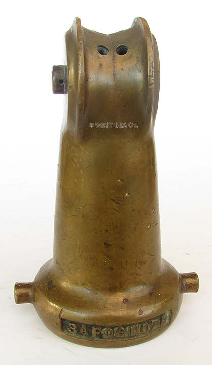 5.83 RARE NAVY NOZZLE. Authentic World War I or earlier shipboard firefighting nozzle used by the U.S. Navy. This heavy-duty fire nozzle is constructed of solid bronze. It is cast in relief at the bottom “3A FOG NOZZLE” and on the opposite side “PAT 1887 747.” What is special about this apparatus is that it represents the first attempt at using aeratedgenerated foam to smother a shipboard fire rather than just water. To these ends it has 6 exist ports on the end and 3 unique aspiration vents on the side for introducing air into the frothy mix. The opposite side of the nozzle is impressed with the distinctive Navy Inspector’s Mark |