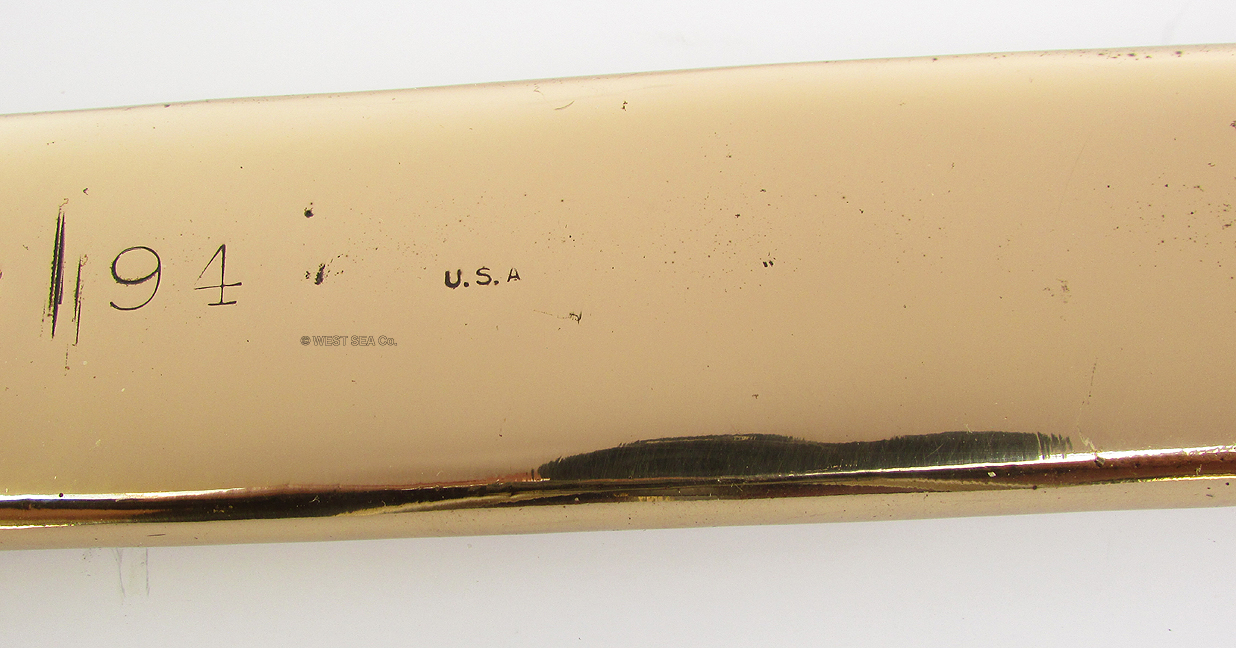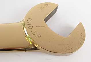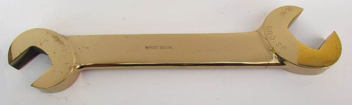 5.88/6.62 BATTLESHIP WRENCH. An especially rare survivor from the powder magazine of a World War II American battleship. This impressive tool is solid bronze. Although unmarked, it could very possibly be Beryllium Bronze (CuBe), an extremely rare and valuable alloy originally used in high tech aviation applications and for non-sparking tools used in dangerous environments with combustible fuels and explosives. This massive wrench is marked <AMPCO> with the date “194 “ stamped “U.S.A.” On the reverse it is stamped “ORD-SB” indicating it was used in the ordnance department. The dual ends are marked “1 13/16” and “1 5/8” respectively. The latter is also stamped with the Navy Inspector’s mark |