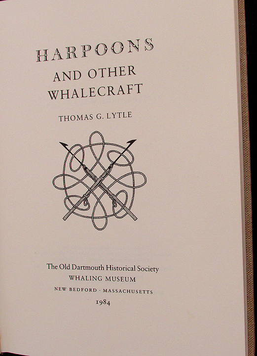 4.56/7.41 REFERENCE BOOK. Thomas G. Lytle, “Harpoons and Other Whalecraft,” 1984, The Old Dartmouth Historical Society, Whaling Museum, New Bedford, Massachusetts. 1st Edition, limited to 600 copies, 256 pages, hard “oatmeal cloth” cover. Copiously illustrated in black and white with photographs, line drawings, prints and period advertisements. Without question the most comprehensive and well-researched treatise on the subject. Lytle begins by stating his intention of providing a “more complete description of the design and fabrication of all known types of American (and English) whalecraft with a full-illustrated catalogue of the collection at the New Bedford Whaling Museum, American patents and biographical information on their makers.” Extra fine condition throughout. 95