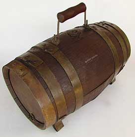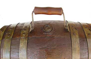 8.88 BOAT WHEEL. Early 1900'ssmall craft helm wheel. This diminutive relic with classic nautical symbolism consists of a cast bronze steering wheel fitted with wooden grips on 6 spokes with brass end caps. The inner rim is stamped “PERKO.” The central brass hub is riveted to a wooden spindle (drum) over which the tiller lines were wrapped connecting to the rudder. The body of the wheel measures a mere 5 3/8 inches in diameter measuring 12 ½ inches across, spoke to spoke. Of particular desirability are the maker’s mark and the existence of the drum, still attached. Excellent original condition noting 2 age cracks in the drum. Nice original age patina. 289 Frederick Persky, a Russian immigrant, schooled in Germany as a machinist, came to the United States in 1890 and soon found work at the Bliss Company in Brooklyn, New York. In the early 1900's he and his partner began their own business out of his house under the name F. Persky & Company, Lantern Manufacturer. In 1907, Frederick's son Louis joined him in the business, and together they enlarged their product line and manufactory. By 1912, then under the name of Perkins Marine Lamp Corporation with trademark PERKO, they were manufacturing a wide range of lanterns and marine products (See item 8.74) |
