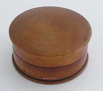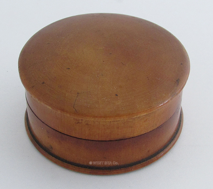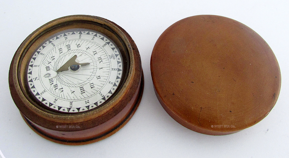 9.43 SUN DIAL. Very scarce, early 19th century “floating gnomon” sun dial of English manufacture. This rare, ingenious device obviated the need for the user to properly align his sun dial with a compass. Cleverly, the body of the dial is mounted atop a functional compass card which automatically aligns it North and South! The circular dry compass card is marked on the periphery with the traditional points of the compass rose. The Cardinal, Intercardinal, and Sub-Cardinal points are identified down to ½ points or a total of 64 divisions in all. The lesser points are identified by “*.” The inner ring consists of a traditional sun dial register indicating hours of the day in Roman numerals, divided into 15 minute increments from 4 in the morning until 8 in the evening. An image of the sun is above the South point and a classic fleur-de-lis marks the North. The gnomon itself is a traditional brass isosceles triangle. The entire interior is protected under its original convex blown glass dome. Telling of its age, the body of this instrument is turned out of rare, nearly extinct boxwood, complete with original press fit cover! 2 ¼ inches in diameter and 1 1/8 inch thick with cover. Absolutely pristine original condition with no flaws. The compass function is lively and accurate. This sundial is 200+ years old! A very rare timepiece which was widely used as the accepted means of telling time in the every early 1800’s. 695 |