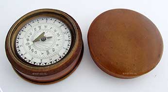 9.27 AMERICAN POCKET COMPASS. Turn-of-the-century traveler’s pocket compass constructed in 2 leaves of wood hinged together. Known as a “diptych” compass, this device has a silvered brass compass in 2 tiers. The bottom is engraved with the cardinal points of the compass with a star denoting north. It is signed “W. & L.E. Gurley Troy.N.Y. ”The upper tier is marked in single degrees running counterclockwise from 0 at north to 359 marked in 10’s. The high quality compass needle has a jeweled pivot and is balanced for accuracy on the southern limb. A high quality caging device locks the needle in place automatically when the lid is closed. A “Lubbers line” is scribed in the lid for sighting. The lid fits snugly on its two hinges and is held by a small pivoting hook. Outstanding original condition. The compass is lively and extremely accurate. 279 W. & L.E. Gurley are perhaps the best known surveying instrument makers in American history. The Gurley name goes back as far as Ephrain Gurley who in 1813 started an iron foundry in Troy, New York. In 1851 Lewis Gurley began a partnership with his brother William. In 1852 they founded the company of W. & L. E. Gurley, not far from where their uncle Ephrain began his work. They advertised as manufacturers of compasses, theodolites, leveling instruments and “apparatus to illustrate the principles of Philosophy.” A fire destroyed their workshop in 1862, but it was quickly rebuilt that same year. Both men were active in the civic activities in their community. William Frank Gurley, son of Lewis began his work in 1882. He became a partner of W. & L.E. Gurley upon the death of his uncle in 1887. The company was incorporated under the name of “W. & L.E Gurley” on October 18, 1899. William Frank died in 1915, but the company carried on under the same name to this day. (Charles E. Smart, “The Makers of Surveying Instruments in America Since 1700,” 1962, Regal Art Press, Troy, New York). |
