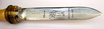 10.00 HARD HAT DIVER’s KNIFE. Authentic, highly sought after U.S. Navy Mark V hard hat diver’s knife made by the Morse Diving Equipment Company as stamped on the heavy bronze sheath, “MORSE DIVING EQUIP. CO. ROCKLAND, MA” This is a rare commemorative model produced by the company in 1987 in recognition of the company’s 150 years in business. The blade is etched with the figure of a hard hat diver and the inscription “Morse Diving Since 1837.” This handsome knife has a razor sharp steel blade on one edge and a serrated blade for sawing on the other. The turned hardwood handle is grooved for a positive grip and features a solid bronze butt and bolster. The bolster has a deep thread matching the solid bronze sheath, which allows the knife to be securely seated with only 1 ½ turns. The bottom of the sheath is equipped with a drain hole to release ambient water. The thick leather dive belt is present for attachment to the diver’s weight belt. The knife measures 12 ¾ inches long overall. The blade is 6 ¾ inches long. With the sheath, the overall dimension is 13 ½ inches long by 2 ½ inches thick. The leather belt loop is 2 feet long. Absolutely factory MINT condition! A rare collector’s item. 895