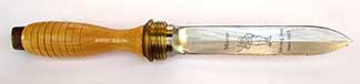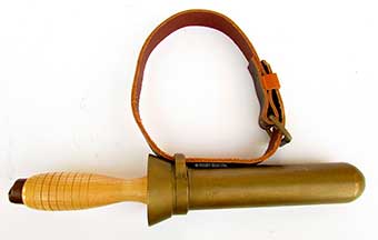 10.83 MARK V TOOL. Scarce, authentic World War II or earlier American-made tool used by a tender to assist a diver in donning his dress. This "cuff stretcher" was made by "Schrader U.S.A." as stamped in the handle. It consists of a handsome solid brass goose neck with flared spade, much like a shoe horn, designed to stretch the tight and bulky canvas/rubber sleeves of a hard hat diving suit. The wooden handle is lovely turned rosewood. 6 ½ inches long by 2 3/8 inches wide on the spade. Very heavy duty and in perfect condition! 195