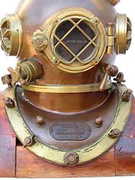 10.35 MARK V DIVING HELMET. Here is an original, highly sought after, and by far most collected hard hat diving helmet ever -- an authentic World War II era U.S. Navy Mark V. This is an early example manufactured by A. Schrader’s Son of New York, the firm which went out of business at war’s end. The front breastplate of this unique looking helmet bears the bears the embossed cast brass oval breastplate maker's tag reading: UNITED STATES NAVY This helmet is made of heavy spun copper with cast brass fittings and thick glass ports. The interior is tinned and the bonnet has air channels leading from the air intake goose neck over the three ports. The phone communicator gooseneck contains its original components with cap and the transducer is present. The chin button and spit cock are in place and function properly. The exhaust valve is impressed with the “BTE” logo indicating its desirable manufacture by the "Batteryless Manufacturing Company” which produced such components in the 30’s and early 40’s. On the exterior, all fittings are original and in tact. The neck ring serial numbers of the bonnet and breastplate match, coinciding with the numbers stamped on the underside of each brale. The front two brales bear markings "FRONT" and the rear two brales are marked "BACK" and on the underside each bears the same bonnet and breastplate number. The entire unit, weighing 55 pounds, is in totally original condition! This old veteran of the sea was obviously well used. It has several small dents in the bonnet. The entire surface bears small pock marks from exposure to salt water, and portions of the helmet are covered with a heavy bluish green verdigris. All of this combines to make this hard hat provide a very unusual and extremely appealing old look. * For the personal privacy of the ultimate buyer, the serial number of this helmet is being withheld. |