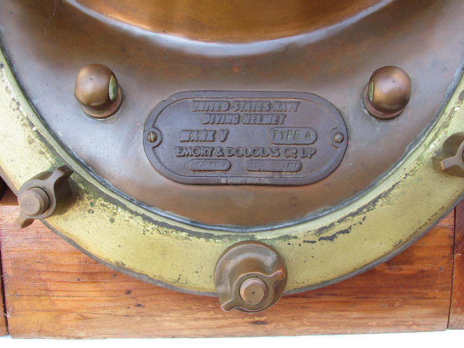 10.36 MARK V DIVING HELMET. This is it! The most sought after hard hat diving helmet ever made -- the U.S. Navy Mark V. Here is an especially nice original example with a thick cast brass maker’s tag affixed to the front of the breastplate. It reads: