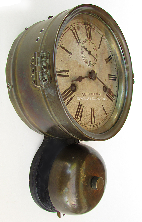 13.20 SHIP’s BELL CLOCK. Early American ship’s bell clock made by the prestigious SETH THOMAS Company as boldly marked between the 2 winding arbors. It is also marked “Made in U.SA.” below the VI. This handsome clock has a silvered brass dial with bold Roman numerals and a minute chapter swept by blued steel spade hands. The subsidiary seconds bit showing individual seconds marked by 10’s is below the XII. Just above is the Fast/Slow regulator. To the left of the IX is the “STRIKE” lever to adjust the ship’s bell sequence. The hinged bezel on the right opening on the left has a brass reflector ring which sets nicely on the dial secured by a spring-loaded latch on the left. The all brass case is the classic ship’s clock form with flared bezel and mounting flanges. It is truly a thing of beauty in its high polish with durable lacquer coating. The bottom of the case has a brass screen to further enhance the sounding of the large brass bell within. 7 inches in diameter and 4 inches deep. This so-called 1 day clock is a strong runner, working 2+ days on a wind, and sounding the ship’s bell sequence with an exceptionally loud, clear ring. 475 Several desirable features distinguish this clock from its famous (and much more expensive) Chelsea Ship’s Bell rival. Chelsea ship’s bell clocks do not indicate seconds. They do not have a ship’s bell sequence adjustment, but must be corrected manually. And they strike on a gong rather than a bell. According to Marvin Whiney author of “Military Timepieces,” 1992, American Watchmakers Institute Press, page 422, he notes “In the late 1920’s Seth Thomas came out with what they announced as their “new “ ship’s bell model No. 7. This 1-day, lever, count wheel striker was used in the Merrimac model, et al.”