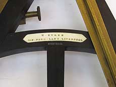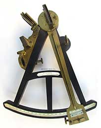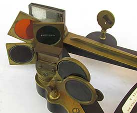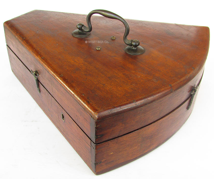 3.66 MARINER’s OCTANT. Especially nice mid-19th century navigational octant of English manufacture. This exceptionally-well preserved example has the ivory maker’s plaque on the center strut engraved “H. SYRED 166. PARK LANE. LIVERPOOL.” This pristine example is a collector’s dream. It is in virtually the same condition as it was made over 150 years ago! It is complete with all of its functioning brass parts. The large ivory scale is calibrated in single degrees from -2 to 100 divided by 20 arc minutes marked in 5 degree increments. The ivory vernier on the index arm is calibrated right to left in single minutes from 0 to 20. This state of the art for its time navigational instrument has a braced brass index arm with knurled brass stop and an endless tangent fine adjust knob. Up to this time only the finest high-quality sextant shad these features. This instrument is complete with both index and horizon mirrors, 3 pivoting index filters and 2 rotating horizon filters. Again, this latter feature is indicative of the octant’s quality. The sighting peep has two openings with a pivoting brass shutter. The back of the instrument has the mirror box adjustment apparatus and all 3 brass “feet” for positioning in its box. The box itself is noteworthy. It is of the early “keystone” type with 2 hook and eye closures. What is unique is that it has a very nice folding carrying handle and it is complete with its original skeleton lock and striker plate. The index arm measures 11 ¾ inches long and the large arc is 9 ¾ inches wide. The box is 12 ½ inches long by 11 ½ inches wide. The quality and overall condition cannot be overstated. It is virtually perfect in all respects! A $1500 value. 799 |