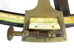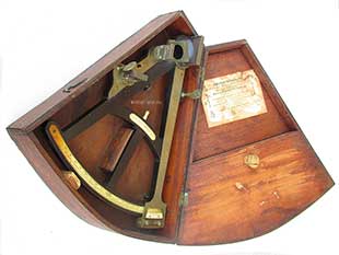 3.68 EARLY MARINER’s QUADRANT. Here is a very special example of a late 18th or turn-of-the-19th century navigational instrument by one of England’s foremost makers. The ivory maker’s plaque is engraved “Spencer Browning & Rust London.” This classic double reflecting instrument, later known as an “octant,” has an ebony wooden frame with brass furniture and ivory scales. The large ivory arc is divided in single degrees from -2 to 99, marked by 5’s, subdivided in 20 minute increments. The scale was calibrated on the firm’s famous 18th century dividing engine as indicated by “SBR” stamped at its mid-point. The flat brass index arm is fitted with an ivory vernier scale reading from 0 to 20 arc minutes right to left. This afforded the observer a reading with an accuracy of about 1 minute (one nautical mile). Innovators that they were, SBR incorporated a positive stop on the back of the arm coupled with a fine adjust tangent screw. This advancement was later incorporated in all such angle measuring devices well into the 20th century! Of great significance to its value, this quadrant is engraved with the Captain’s name in script on the index arm. It reads “Jacob Drummond.” This instrument has both index and horizon mirrors and all 3 index filters. The peep sight is of early form with two apertures and an unusual circular pivoting shutter. Also attesting to its early age is the vestigial back sight with mirror. That feature became obsolete and was no longer used by 1820. But in keeping with its early style, the index filters are replaceable for either the foresight or backsight functions. The back of the instrument is totally complete. It has notable features: The mirror box is adjustable with a knurled knob allowing for a much finer adjustment than earlier “ butterfly” hand adjustments (which it still has for its out-dated backsight)! There are 3 brass “feet” for positioning in its box and an ivory note pad for recording readings. To these ends, it retains its rarely-found ivory pencil within the cross brace. This instrument is housed in its original stepped keystone case. The case adds significantly to the value of this offering. Firstly, it is made of very dense African mahogany of the finest quality. Secondly, the construction is with fine, hand-fitted dovetails. Thirdly, the box has a very unusual internal mount which securely holds the instrument in place. Fourthly, the case has very decorative serpentine extensions reinforcing the box. We have not encountered this exceptional detail in our 45+ years in the business. The box is complete with both hook and eye closures. Lastly, there is the very decorative later servicing label of “Thomas Hemesley11 Kings Street, Tower Hill, London” in the lid depicting early navigational instruments of the era. The quadrant measures 14 inches long on the index and 11 ¼ inches wide. The box is 15 ¼ inches long by 13 ¾ inches wide and is 4 inches thick. Overall condition is outstanding all respects, considering this instrument is at least 225 years old! 1600 According to M.V. Brewington, curator of the Peabody Museum, Salem, Massachusetts and author of the reference book “The Peabody Museum Collection of Navigating Instruments” 1963, “There are more extant instruments by this firm than any other. It would appear that the firm sold wholesale to dealers all over England and America. The firm first appears in the London Directories in 1780 and High Street, Wapping , London. In 1843 the name was changed to Spencer, Browning & Co.” Thomas Hemsley II worked as an optician, mathematical instrument maker and nautical instrument maker at Sing Street, Tower Hill, London beginning in 1828. (Gloria Clifton, “Directory of British Scientific Instrument Maker 1550 – 1851”, 1995, The National Maritime Museum, and Zwemmer, Philip Wilson Publishers.) |