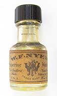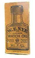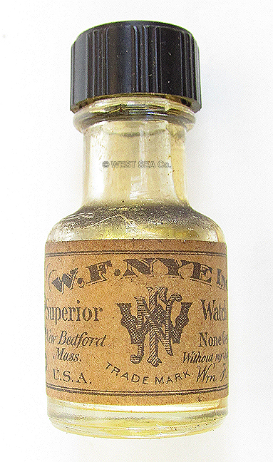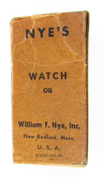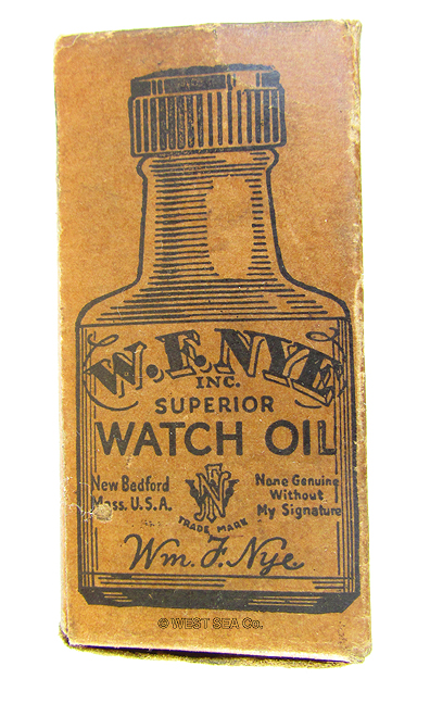 4.57 WHALE OIL Original bottle of high grade whale oil with the label reading “W.F. NYE , Inc. Superior Watch Oil New Bedford Mass. U.S.A. None Genuine Without My Signature” Wm F. Nye “with his conjoined initials trademark. The little glass bottle with hard rubber screw-on cap is half full of the original contents of prized sperm whale oil. It is complete with its original cardboard carton (missing lid) bearing the same information. 2 5/8 inches tall by 1 ¼ inches square. The bottle, its label and contents are in excellent condition. The box is an added bonus. A rarity. 95 |