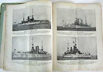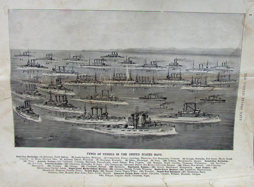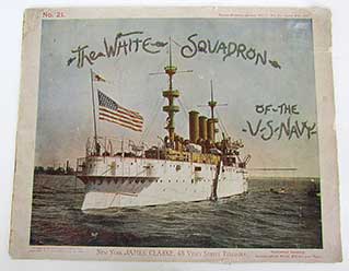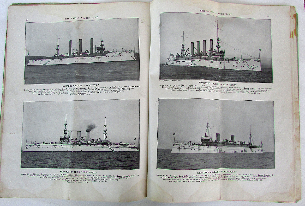 5.96/23.31 PERIOD 1800’s U.S. NAVY BOOK. An exceptional photographic documentary of the U.S Navy’s battle fleet published while America was still fighting the Spanish Armada in the midst of the Spanish-American War! The cover reads “The WHITE SQUADRON- OF- THE U.S. NAVY, New York, James Clarke 45 Vesly Street Publisher,” and is dated June 9th, 1898. This was during the height of that conflict. The cover shows a full color starboard stern view of the USS BROOKLYN at anchor flying a prominent American flag. This large format, soft cover book contains 20 pages of black and white photographic images of the famous combatants including “The Protected Cruiser “San Francisco,” “The Protected Cruiser “Chicago,” “The Protected Steel Cruiser “Baltimore,” “The Protected Cruiser “Charleston,” The Protected Cruiser “Newark,” The Steel Cruiser “Atlanta,” The Protected Cruiser “Boston,” Gunboat “Bennington,” The Armored Cruiser “New York,” The Double-Turret Monitor “Miantonomah,” and the Dynamite Cruiser “Vesuvius” amongst others. All images are of crisp lithographic quality, not later dot matrix copies of the originals. The large prints measure 8 by 10 inches. The smaller insets are 5 by 6 ½ bearing charming pen and ink drawings of nautical subjects. Overall size is 13 ½ by 11 inches. This is a very RARE book of which few have survived given its soft cover construction. Museum-Quality. We are pleased to be able to offer this historic document to our dedicated U.S Navy customers at this nominal price. 175 |