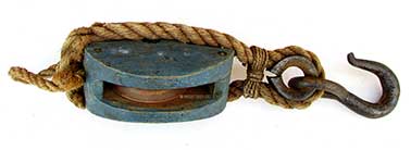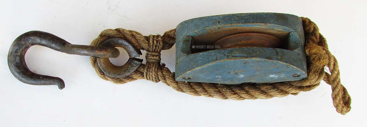 6.66 EARLY SHIP’s BLOCK. Particularly nice example of a mid-19th century ship’s rope-stropped block as used on sailing ships of the era. This handsome example has cheeks of oak and a lignum vitae sheave. The heavy hemp rope is bound over an iron eye attached to a hand-forged iron hook. The hook is served in a seamanlike manner with a becket at the bottom for attachment. 18 inches long overall. The block itself is 6 ¾ inches long by 2 7/8ths inches thick. With the rope covering it is 4 ¾ inches thick. Outstanding original condition in all respects. The body of the block is painted in its traditional, very desirable New England Robin’s egg blue. This is a rare, excellent example of American seamanship from the days of sail. 279 |