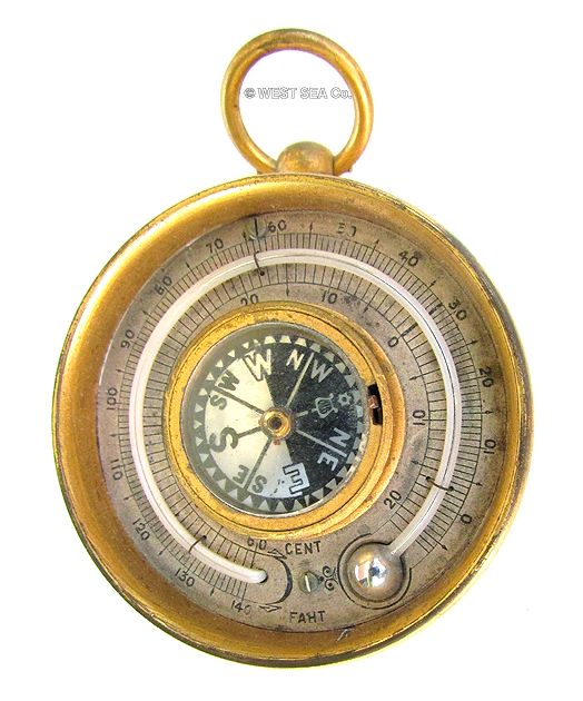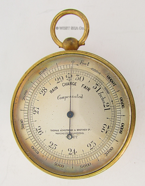 9.41 COMPENDIUM. Finest quality19th century gentleman’s pocket compendium comprising 4 functions in one instrument! Barometer – altimeter – compass – thermometer. The aneroid barometer function features a silvered brass dial indicating atmospheric pressure with a huge range spanning 21 to 31 inches calibrated in whole inches divided down to 5/100ths. It is marked “RAIN, CHANGE and FAIR” below which it is marked “Compensated” indicating it is adjusted for temperature changes. A delicate indicator needle points the reading. The dial is signed “THOMAS ARMSTRONG & BROTHER, Ltd., MANCHESTER & LIVERPOOL” The altimeter is embodied in the rotating rim surrounding the dial. The elevation is marked from 0 through an impressive 10,000 feet subdivided in 50 foot increments! The back of the instrument contains two more functions. There is a circular mercury thermometer which indicates the range of degrees Fahrenheit from -7 to 140. It is marked “FAHT” at the bottom of the dial next to the adjustment screw for setting the barometer. The Centigrade designation is from -18 to 60. In the center is the magnetic compass under beveled glass. It indicates the standard 32 compass points on its mother-of-pearl card with the Cardinal and Intercardinal points identified. North is designated by a star above a lyre. The body of the instrument is gilt washed brass with a small pivoting suspension loop at the top. The rim of the altimeter is knurled for ease of setting the reading. The entire instrument measures 2 inches in diameter and 1 inch thick. With the loop it measures 2 ¾ inches in length. The unusual double hinged leather case is wood with a satin lining. It measures 1 ½ inches thick and 3 inches long. Outstanding original condition showing careful use. The exterior of the case is perfect. The gold finish is 97%, ALL functions operate properly. Without question, this is a very rare, highly sophisticated scientific instrument made for the nobility. 795 According to Kornelia Takacs in her comprehensive reference book ”Compass Chronicles,” 2010, Schiffer Books, Atglen, Pennsylvania, this compass was made in accordance with Samuel Barry Singer’s 1861 patent. The dry card dial is distinctively marked in half-black, half-white, providing a sharp contrast which was much easier to see in low light. A nearly identical compass dial is shown on page 42, dated at circa 1868. Two similar examples are shown, dating 1870 and 1880 respectively (p. 44). See item 9.33 |