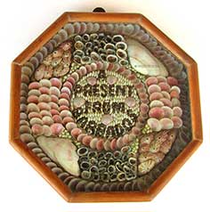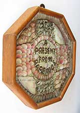 11.89 BOTTLE SHIP DIORAMA. Unique sailor-made ship in a bottle diorama. It consists of a large vessel under full sail plying a white-capped azure sea. The ship, with raised foc’sle and poop decks, flies the Norwegian flag from the spanker aft. It is beautifully-rigged in a very unusual configuration known as a 4-masted “Jackass Barque” or “Jigger-Barque.” This “Bark” is depicted sailing past a small town on a hillside with lighthouse and several buildings behind it. Forward there is a flagpole and a signaling mast flying pennants, with more small buildings and trees. The scene is enclosed in a crystal clear blown glass wine bottle with dimpled bottom. A painted blue sky fills out the scene. Attesting to its origin as “sailor-made” the stopper is encased in a beautifully-executed series of half hitches followed by Turk’s head banding… both classic examples of Marlinspike seamanship. 11 ¾ inches long by 3 ½ inches in diameter. Outstanding original condition. 349 |