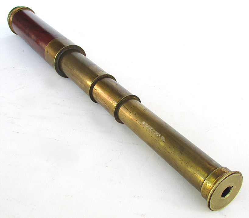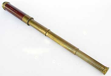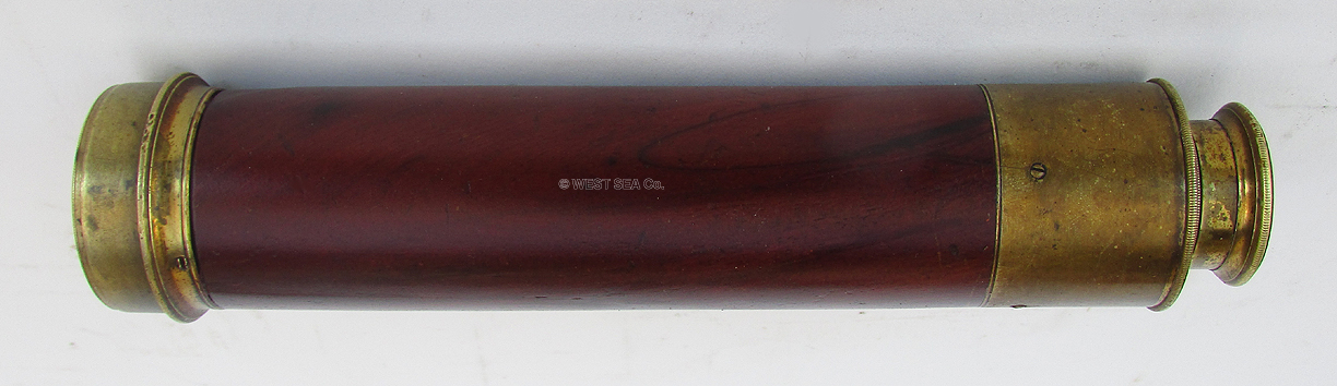 21.70 TELESCOPE. An exceptional example of a mid-1800’s or earlier English hand-held Captain’s telescope made by a quality maker. This handsome example has 3 brass draws and a solid mahogany (not veneered) main body. It contains the classic English erecting system of the era which featured 4 internal elements in conjunction with a 2-part achromatic objective lens to provide a state-of-the-art, for its time, clear upright image of high magnification with no peripheral distortion. This important innovation dates back to Peter Dollond in 1751! Although unsigned (which was typical of many 19th C. makers) this example exhibits all of the highest quality features offered at the time. The telescope measures 8 3/4 inches closed, fully extending to 13 ½ inches. The objective is 1 ½ inches in diameter. The draws are smooth and tight and the magnified image they produce is without flaw. Complete with built-in ocular dust slide. This is a most handsome, pristine example of such a telescope, well over 175 old! 395 |