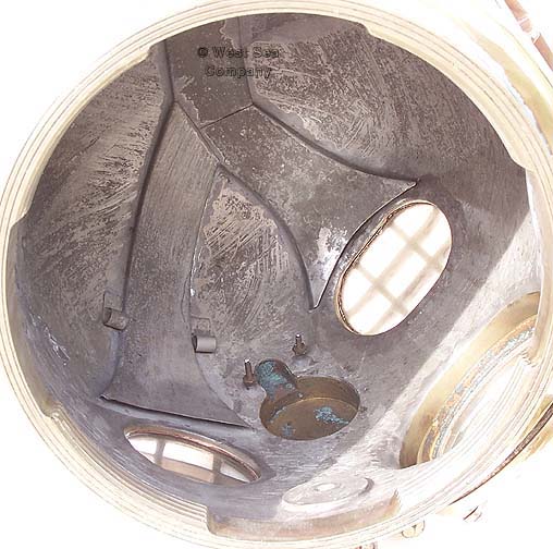 The inside of a Mark V bonnet. Note: 1. The flared vents which spill air onto the three ports or "lights" within the helmet preventing them from fogging with condensation. 2. The small round gray clips and the two threaded studs to hold the communicator and its cable. |