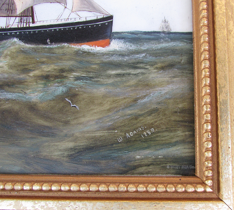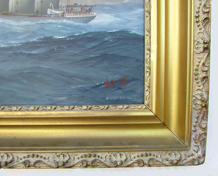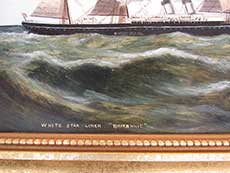 1.01 PAINTING. Genuine 19th century rendering of the famous British steam/sail liner the S.S. BRITANIC. Oil on artist’s board, measuring 9 ½ by 7 ½ inches sight. This classic broadside view depicts the impressive ship under full sail plying an assure sea. It is nicely executed with good detail, showing distant vessels on the horizon on both sides. It is titled lower center “WHITE STAR LINER BRITANIC” and is signed lower right “ADAMS 1883.” 9 ½ by 7 ¾ inches sight. It is housed in a very nice contemporary guilt wood frame measuring 12 ½ inches long by 10 ½ inches high. Outstanding original condition. A real gem, 135 years old, at a bargain price! Ready to hang. 795 RMS BRITANIC was a single-screw passenger steamship equipped with sails, built for the White Star Line's North Atlantic run. Together with her sister ship GERMANIC, BRITANIC sailed for almost 30 years, carrying immigrant passengers on the Liverpool to New York route. In 1876 she received the Blue Riband for both her westbound and eastbound crossings, averaging 16 knots. BRITANIC, as most White Star ships (including TITANIC), was built at the famous Harland & Wolff shipyard in Belfast, Ireland. She was the first White Star ship to have two funnels. Although steam powered, she was still fitted with traditional auxiliary sails, and was rigged as a four masted barque. While researching this vessel we found a print of a nearly identical image, probably taken from this original painting. |