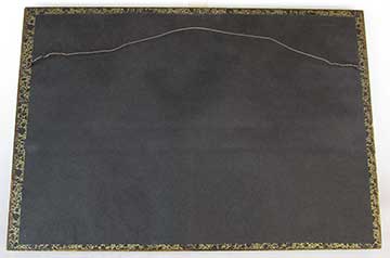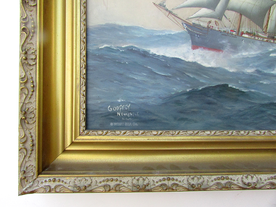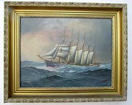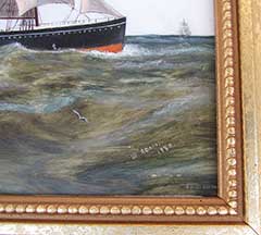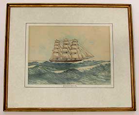 1.02 PAINTING. Hely A. M. Smith, English (attrib). Classic late 19th century oil on artist’s board painting depicting a 4-masted barque underway with full sail in rolling seas. The handsome ship is shown on a port broadside view with seagulls frolicking in the foreground above a realistic ocean green sea. The ship shows good detail in the rigging and on deck. Several crewmen are shown both on the foc’sle and on the poop deck. The ship flies the British ensign from the spanker aft. At least 4 vessels are depicted on the horizon. Of particular note is the exceptional rendering of a cutter on the port quarter aft. The painting is signed “HS” lower left dated “1883.”. It measures 11 by 17 1/2 inches sight and is housed in a blacken wood frame with gilt liner measuring 16 by 22 ½ inches overall. Outstanding original condition with no inpainting or repairs. Ready to hang. This is a fresh to the market estate find. WAS $1,195 NOW! 395 |