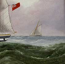 1.24 FAMOUS YACHT PAINTING. John Hughes, British-American, (1806-1878) (attrib.) oil on artist's board of the most famous racing yacht of them all, the Yacht AMERICA. This dramatic rendering depicts the schooner AMERICA under full sail slicing through waves with spray in a stiff breeze on a port tack. She flies the American ensign from the spanker and at least seven crewmen are visible on deck. The painter has captured the instant in time with realistic detail down to the mast hoops, reefing lines and decorated billet. The scene is an open ocean yacht race with 3 other yachts on similar tacks and a 3-masted bark in the far distance. Painted at the peak of Hughes' career, this painting very possibly it is THE Royal Yacht Squadron's Regatta in which AMERICA won the America's Cup in 1851. It measures 17 1/2 by 11 1/2 inches and is housed in a magnificent period antique gilt gesso frame measuring 27 1/4 by 21 inches. Outstanding condition in all respects. SOLD To those familiar with yachting history the AMERICA needs no introduction. AMERICA's genesis was sparked by an invitation from the Royal Yacht Squadron in England for an American vessel to participate in the Great Exhibition. Under Prince Albert's guidance, the exhibition was to be the first World's Fair up to that time. New York Yacht Club Commodore John C. Stevens took up the call and set about to build the "fastest yacht afloat." Stevens gathered a syndicate including Edwin Schuyler, J. Beekman Findlay and Hamilton Wilkes. They commissioned yacht designer George Steers, then working at the yard of William Brown on the East River in New York. What they created was a yacht with clipper bow, sharp forebody and a broad beam of 23 feet well aft. With a registered length of 93 1/2 feet and an 81 foot main mast, the yacht displaced 170 tons. Launched on May 3, 1851, to the most critical American eye she had particular grace. However when the tradition-steeped British builders first saw her they were horrified! AMERICA arrived in British waters in July, however no races had been planned and no serious British challenges offered. Almost as an afterthought AMERICA's skipper, Richard Brown, suggested that his yacht be entered in the Royal Yacht Squadron's regatta race around the Isle of Wight for an "ordinary cup" worth one hundred guineas. The day of the race, Queen Victoria herself, aboard her yacht VICTORIA AND ALBERT was on hand to view the spectacle. 18 yachts were entered into the race. On board AMERICA, were 21 men including a local pilot. At the start of the race AMERICA was last to get underway, but as the yachts reached The Needles for the run home a signalman on the Royal Yacht reported sighting the AMERICA. "Oh, indeed! And which is second?" was the Queen's query. As the signalman again swept the horizon with his spyglass, with a quivering voice he announced, "I regret to inform Her Majesty there is no second." As it turns out of course, there was a second, the gallant little yacht AURORA. But she was so far behind that the actual time of her crossing the finish remains unclear. The London Illustrated News reported a lapse of 21 minutes. Some 20 years after the race the New York Yacht Club accepted 8 minutes as the official figure. It was a Yankee victory and a notable one which was to profoundly shake British yachting circles for decades to come. The "Aulde Cup" as it came to be known and later, popularly, the "America's Cup," found a home in the New York Yacht Club for the next 132 years! |