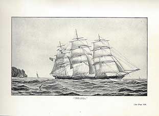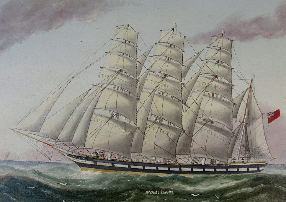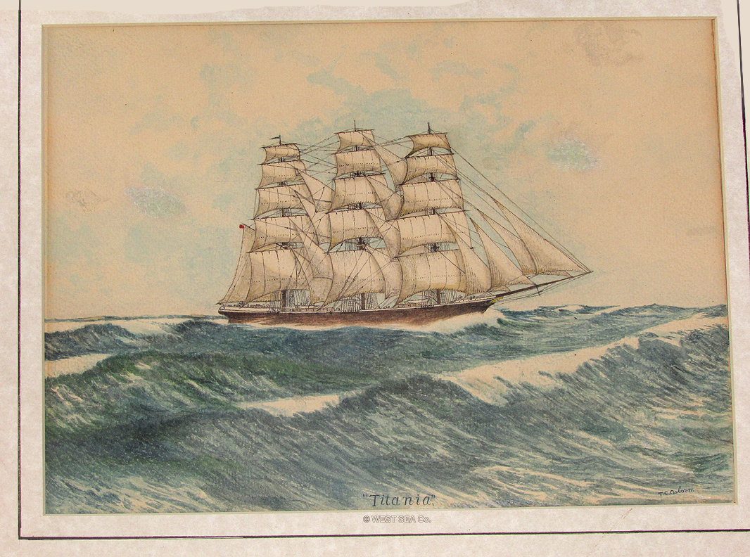 1.03 SHIP’s PORTRAIT PAINTING. Watercolor and ink on artist’s paper depicting a starboard broadside view of the famous English tea clipper “Titania.” as boldly titled lower center and signed “T.C. Osborne.” lower right. In this dynamic rendering the grand ship is shown under full sail plowing through wavy seas. She flies a pennant from the aftermast and the British ensign from the spanker. Execution is very fine showing the ship’s figurehead, foc’sle fittings, deck houses, lifeboats, passengers at the rail, the ship’s skylight and its helmsman on the raised poop deck at the wheel. All standing and running rigging is meticulously detailed. The crisp image is colorful and bright. The painting was originally matted under old glass in its original simple gilt wood frame and bears the professional framer’s label of “(KE)NSINGTON ARTS Picture Framing, Library Arts,1056 Robson Street, Vancouver, B.C.” with early phone number. The image measures 8 ¾ by 12 inches site, and the frame is 16 by 18 ¾ inches overall. Over 100 years old. Excellent original condition. Ready to display. 495 The 4 composite-built English tea clipper TITANIA was launched in 1866. She was very profitable in the tea and spice trade to the Far East. In 1871, under Capt. J. Dowdy, TITANIA made the fastest passage of the year – 93 days from Foochow to England against a SW monsoon. She was purchased by the Hudson’s Bay Company in 1880. TITANIA ended her days working in the Mediterranean where, in 1910, she was finally broken up in Marseilles, France. |