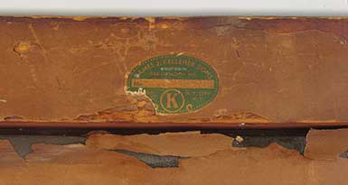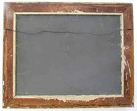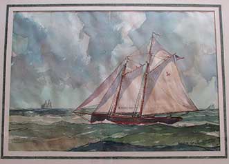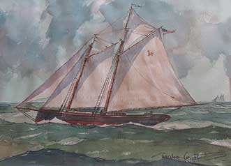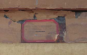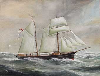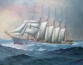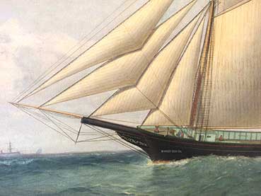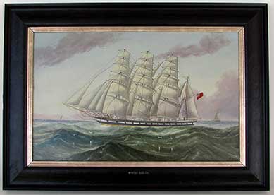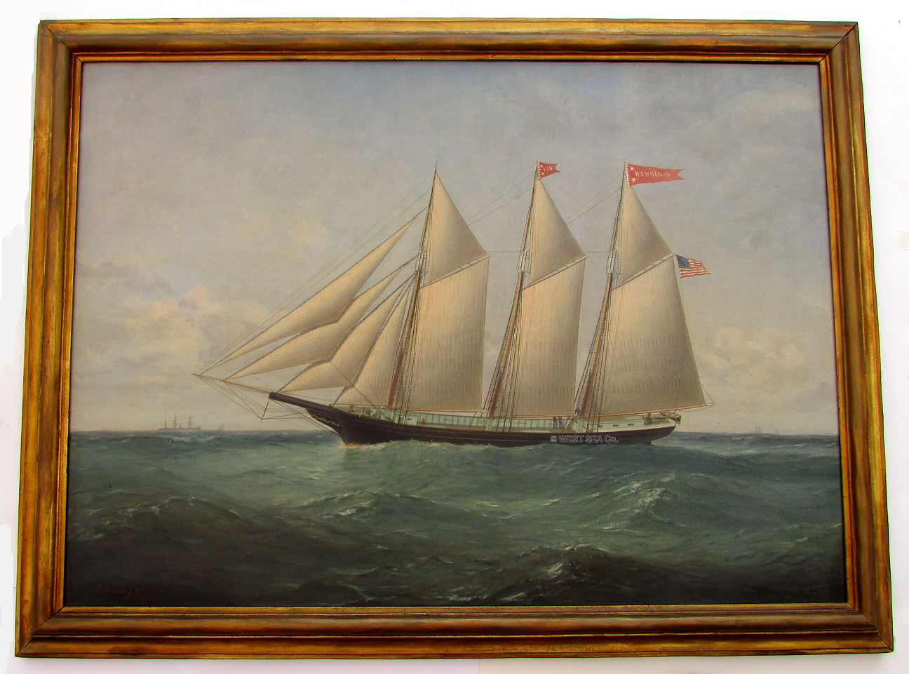 1.34 PAINTING. William Pierce Stubbs, American, 19th century, oil on canvas, ship’s portrait of the 3-masted schooner MORRIS W. CHILD. This original large format rendering depicts the vessel in a port side view at sea under full sail. An island with lighthouse is shown on the left, while a steamer is visible on the horizon to the right. The handsome schooner flies the Union Jack from the foremast, the owner’s flag from the main, a colorful swallow tail name pennant from the mizzen and the American ensign from the spanker aft. The artist has lavished particular care in portraying the complex rigging as well as deck details, including crewman about their chores amidships and on the poop. This painting measures 22 by 36 inches sight and is housed in its original ornate gilt gesso frame measuring 32 ¼ by 46 ¼ inches. It is signed lower left, “W. P. Stubbs.” Condition is excellent. The painting has been professionally cleaned and relined, retaining all of its original color, brightness and detail. The ornate frame with floral designs has been fully restored. According to a label on the reverse this work was performed by Fynmore Studios, Boonville, N.Y. in April 1973. Examination under black light shows modest inpainting, primarily in the sky and on the periphery due to stretcher bar wear, as expected of oil on canvas paintings over 100 years old. SOLD The 3-masted schooner MORRIS W. CHILD, official number 91311, call sign J.V.F.L., was built in Bath, Maine by H. M. Bean in 1881. She had a length of 145 feet, a breadth of 34 feet, a draft of 12 ½ feet and displaced 513 gross tons. As of 1885 her master was Captain Torrey and her owners were J.P. Ellicot and Company, homeported in Boston, Massachusetts. (“The Record of American & Foreign Shipping,” 1885, American Shipmasters’ Association). |