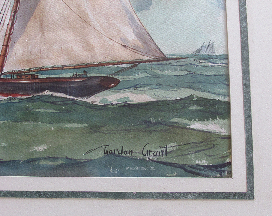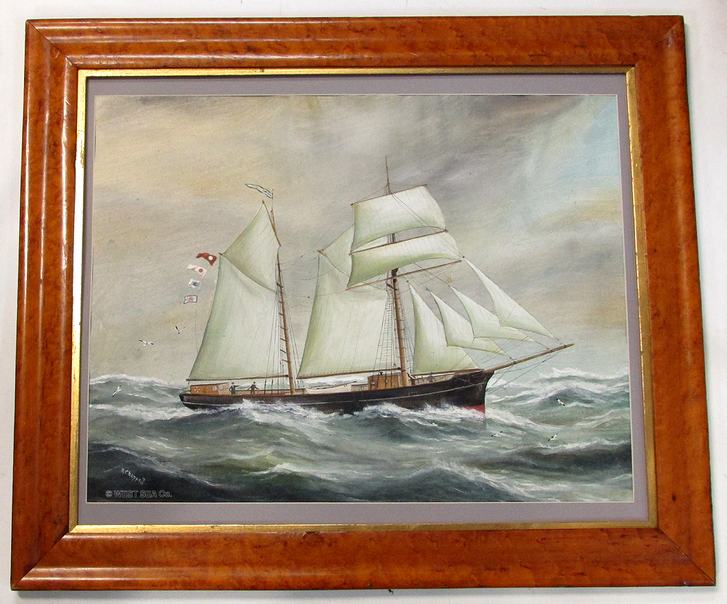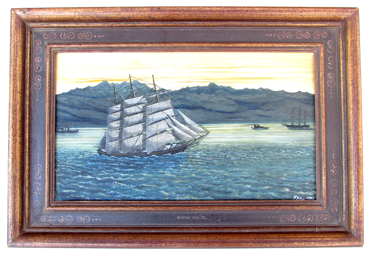 1.04 PACIFIC NORTHWEST PAINTING. Late 19th century watercolor and gouache depicting shipping on one of the many inland waterways of Puget Sound, Washington. This pleasing scene is signed by the listed American marine painter “J. F. Jackson 1892” lower right. It shows a 3-mased full-rigged ship plying a wavy sea at sunset. Mountains and shipping are beautifully depicted in the background. Details of the ship are very well executed showing standing and running rigging with reefing lines on all sails. Stern and foc’sle details are also shown. In the background a steam/sail ship is shown on the left and a tug towing another 3-master on the right. The entire scene is preserved under glass in its hand-decorated gilt wooden frame. 7 by 12 ¼ inches sight. The frame measures 11 by 16 ½ inches. Overall condition is perfect in all respects. A very nice mid-size marine painting over 130 years old by a noted watercolorist. 449 |