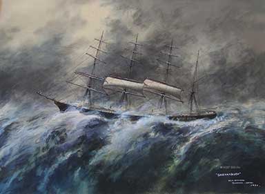 1.96 WATERCOLOR ON SILK. H. Shimidzu, Japanese, early 1900’s. Amazingly detailed painting of the famous Confederate Clippership SHENANDOAH in a gale. The painting is signed lower right “SHENANDOAH By. H. SHIMIDZU, Yokohama Japan. 1930.” It portrays this most famous rebel ship plowing through massive storm tossed seas under reefed sail on the main and mizzen. Details of the ship are exquisite, with the artist conveying dramatic movement and magnitude of the moment. The painting measures 14 by 19 inches. It is in brilliant, MINT condition, having never been displayed or seen the light of day. For over 90 years it has been kept in its original tube with the silk pinned to its rice paper backing. A rare depiction of a classic Civil War clippership by this most famous Japanese ship portrait painter. Ready for framing. 995 Interestingly, Shimidzu has taken artistic license in portraying SHENANADOAH as a 4-masted bark, when in reality she had 3 masts! From the estate of a pre-War American merchant marine sailor. Ship portrait artists, in the tradition of earlier European port painters, began appearing in Japan in the early 1900’s. The first and perhaps best known marine painter of that era was H. Shimidzu, who painted from his studio in Yokohama, Japan. He created a number of small to medium size oil and watercolor paintings on silk and became a very popular ship portraitist. His works show a high degree of skill and accuracy which usually depicted steamers or sailing ships. He sometimes included a local background, often Mount Fuji, or in this rare case, the Tokyo skyline. Shimidzu is represented in the Peabody Museum, Salem, Massachusetts as mentioned in their Catalogue and in other literature about Marine Artists (e.g., Archibald, “Dictionary of Sea Painters” and Dorothy Brewington, “Dictionary of Marine Artists”). Name: SEA KING, SHENANDOAH, EL MAJIDI Renamed : CSS SHENANDOAH CSS SHENANDOAH, formerly known as SEA KING then EL MAJIDI, was an iron hulled full-rigged sailing ship with teak decking famous for her actions under LCDR James Waddell of the Confederate States Navy during the American Civil War. SHENANDOAH was originally a British merchant ship launched as SEA KING on August 17, 1863, but was repurposed to become one of the most feared commerce raiders in the Confederate Navy. For more than 12 months from 1864 to 1865, the ship undertook commerce raiding around the world in an effort to disrupt the Union's economy. Its efforts resulted in the capture and the sinking of 38 merchant vessels, most of which were whaling ships. She finally surrendered on the River Mersey, Liverpool on November 6, 1865, fully six months after the war had ended! SHENANDOAH was known to have fired the last shot of the Civil War when she encountered a whaler in waters off the Aleutian Islands. Initially intended for the Far East tea trade and troop transport for the growing intervention of Western powers in China, she began to be fitted out as U.S. representatives assessed her for purchase. After a number of trips carrying cargo to the Far East and transporting troops to the New Zealand Wars, the Confederate Navy secretly purchased her from Wallace Bros. of Liverpool in October 1864. Renamed CSS SHENANDOAH, the ship was converted into an armed cruiser with a mission to capture and destroy Union merchant ships. Liverpool was the unofficial home port of the Confederate overseas fleet and the city provided ships, crews, munitions, and provisions of war. SEA KING sailed from London on October 8, 1864, ostensibly for Bombay, on a trading voyage. At the same time the Steamer LUAREL sailed from Liverpool. The two ships rendezvoused at Funchal, Madeira. LUAREL carried officers and men, along with naval guns, ammunition, and ship's stores. The new Confederate cruiser was commissioned on October 19, 1864, lowering the Union Jack and raising the Confederate flag under the name CSS SHANANDOAH. At the outset, the Confederacy tasked SHANANDOAH to strike at the Union's economy by "seeking out and destroying" its global commerce. Captain Waddell began attacking enemy merchant ships on the Indian Ocean between the South Africa and Australia, and in the Pacific. En route to the Cape of Good Hope, the Confederates captured 6 prizes. After the crews and passengers had been removed 5 were burned or scuttled. The sixth was bonded and used to transport the prisoners to Bahia, Brazil, where they were released. |