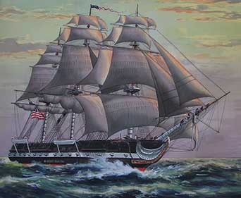 1.97 PAINTING, AMERICA’s MOST FAMOUS SHIP. Water color on silk, H. Shimidzu, Japanese, early 1900’s. Exquisite rendering of one of the most enduring and fabled ships in the United State Navy, the venerable USS CONSITITION, depicted here underway in choppy seas under full sail. The majestic ship is shown flying the commissioning pennant from the main and old glory at the stern. Significantly, many crewmen are shown precariously astride the bowsprit reefing the jib sails while many more are portrayed on the foc’sle. It is boldly signed “US. FRIGATE “CONSTITUTION BY. H. SHIMIDZU. YOKOHAMA JAPAN. 1930. “ The painting measures 14 ¼ by 20 ¼ inches. It is in brilliant, MINT condition, having never been displayed or seen the light of day. For over 90 years it has been kept in its original tube with the silk pinned to its rice paper backing. A very rare depiction of the famed American ship known as “OLD IRONSIDES” by this noted Japanese port painter. 1195 From the estate of a pre-War American merchant marine sailor. Ship portrait artists, in the tradition of earlier European port painters, began appearing in Japan in the early 1900’s. The first and perhaps best known marine painter of that era was H. Shimidzu, who painted from his studio in Yokohama, Japan. He created a number of small to medium size oil and watercolor paintings on silk and became a very popular ship portraitist. His works show a high degree of skill and accuracy which usually depicted steamers or sailing ships. He sometimes included a local background, often Mount Fuji. Shimidzu is represented in the Peabody Museum, Salem, Massachusetts as mentioned in their Catalogue and in other literature about Marine Artists (e.g., Archibald, “Dictionary of Sea Painters” and Dorothy Brewington, “Dictionary of Marine Artists”). |