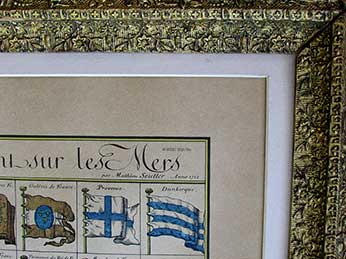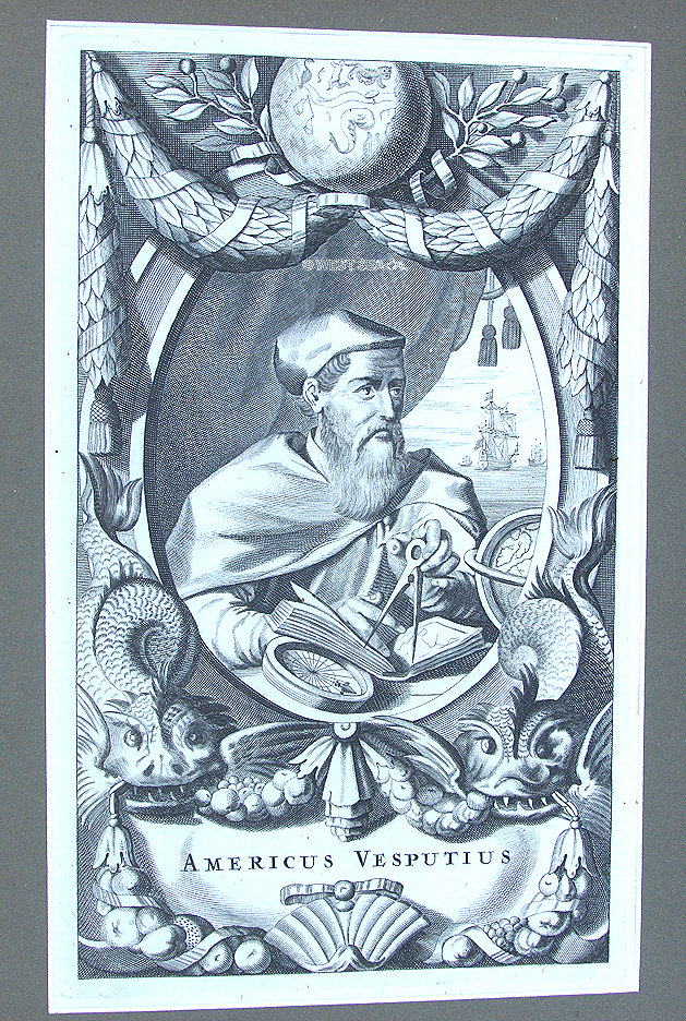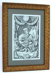 1.99 FAMOUS EARLY ENGRAVING. Guaranteed authentic, period copper plate engraving depicting the namesake of America, entitled “Amerigo Vespucci” in an elaborate setting befitting his discovery of “America.” This original depiction shows the famous explorer surrounded by iconic elements rich with the promise of fascinating new discoveries. At the top is a celestial globe describing the constellations. It is flanked by floral wreaths and festooned garlands. The image of the explorer himself is very bold. He holds a mariner’s chart divider and an early compass with a galleon in the background. Another terrestrial globe is to his left. Two dragon-like dolphins adorn the bottom of the image which is boldly entitled “AMERICUS VESPTUTIUS” at the bottom. Beautifully framed under old wavy glass in an antique orate gilt gesso frame 9 ½ by 14 1/2 inches sight. The frame measures 12 ¼ by 17 ¼ inches. Outstanding original condition for this historic relic over 350 years old! Ready to hang. One of the oldest antiques we have ever offered. WAS 895 NOW! 495 The famous explorer Amerigo Vespucci (1451-1512) was a Florentine (Italy) navigator whose name “America” was given to the newly discovered continent. Between 1497 and 1504, he sailed on two voyages in the “Age of Discovery;” the first on behalf of Spain (1499–1500) and then Portugal (1501–1502). In 1501, while on his Portuguese expedition Vespucci determined that Brazil was part of a fourth continent heretofore unknown to Europeans. He called it the “New World.” His claim inspired cartographer Martin Waldseemuller to recognize Vespucci's accomplishments. In 1507 he applied the Latinized name "America" to a map showing the New World. Other cartographers followed suit. By 1532 the name America was permanently affixed to the newly discovered continent(s). In 1671 cartographer and bookseller, John Ogilby, published “America, being an accurate description of the New World.” Ogilby’s book was an English translation of a work describing North and South America by Dutch writer Montanus. Ogilby’s “America” was lavishly illustrated with plates and maps by Jacob van Meurs, the Amsterdam engraver who published the original Dutch version. Subsequently he allowed Ogilby to borrow his copper plates. Although it claimed to be “An accurate description of the New World,” the work contained many errors which included fanciful descriptions of the people and animals of the Americas. Since neither Montanus nor Ogilby had actually visited the New World they were reliant on explorers’ accounts and secondhand descriptions. Even so, the book was widely read by Europeans fascinated by the New World. Despite its shortcomings, it continued to be a valuable source of information about the flora and fauna of America at that time. It also provided an illustrated account of the arrival of the Native Americans (assuming they immigrated from somewhere else) and the exploration and conquest of the New World by the Europeans, beginning with Christopher Columbus. |