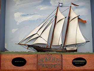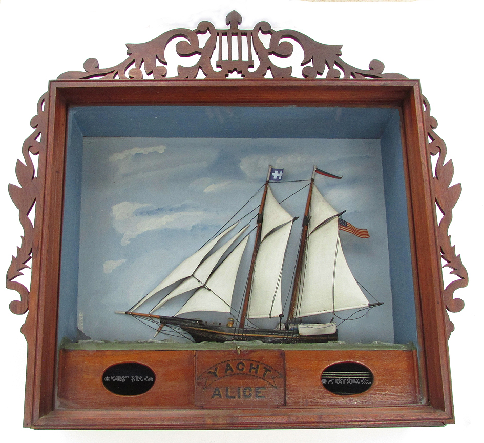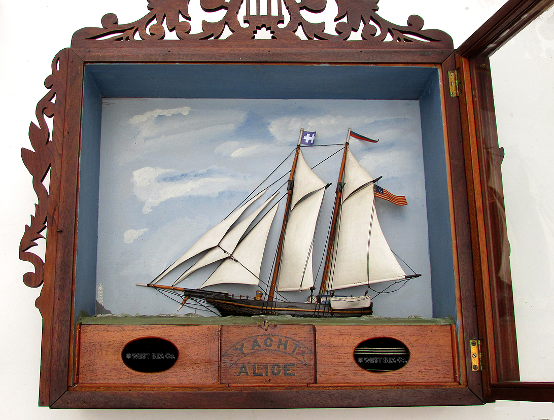 2.96 SILVER MODEL. Delightful, cased model of a gaff-rigged sloop under full sail plying a wavy sea. The model has all 5 sails set and is flying a pennant from the mast. The mains’l shows mast hoops properly rigged. The solid silver hull shows simulated planking surrounding the cabin and cockpit. The helm is realistically portrayed with a classic ship’s wheel. The hull is marked “STERLING 960.” The entire presentation is housed under 5 panels of clear glass within its handsome original rich hardwood frame of pinned construction, The case measures 9 1/8 inches high by 5 inches wide and 8 inches long.. Superb original condition. An ideal gift for that significant yachtsman! WAS $895 NOW only 395 |