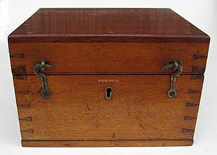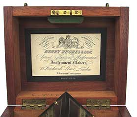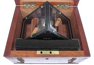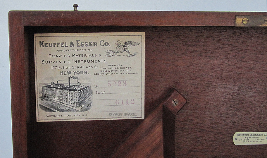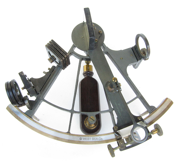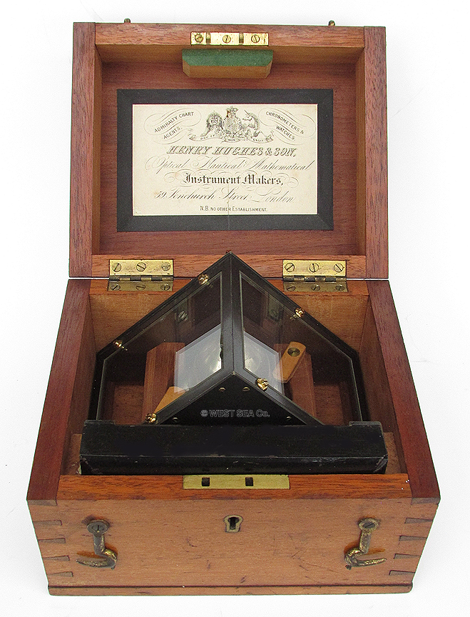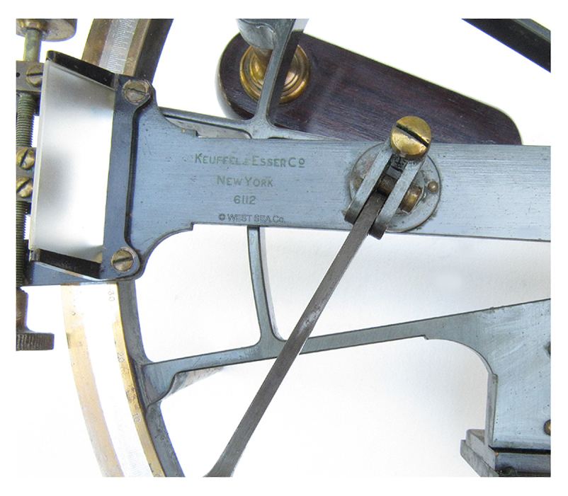 3.11 AMERICAN SEXTANT SET. Ultimately rare, perhaps one-of-a kind, cased 19th century double sextant set made by the prestigious American scientific instrument company “Keuffel and Esser, New York” as engraved on the index arms and as indicated on their respective labels. This matched set features not one but TWO sextants contained within their single dovetailed mahogany box. Each sextant is made of cast bronze with classic lattice frame design in their original factory oxidized finish. The index arms are signed “Keuffel & Esser Co., New York” and are serial numbered “6101” and 6112” respectively. The large arcs are inlaid with silver scales reading from -5 degrees through 165 degrees, effectively making them “quintants.” The scales are subdivided in 20 arc minutes, with the vernier scale allowing an accurate reading down to 30 arc seconds. To aid in the reading each vernier is equipped with a light diffuser on the index arm and a pivoting magnifier. The index arm features a knurled thumbscrew stop and the double tangent screw fine adjust feature as introduced by the French circa 1880. Both instruments are complete with their full set of 4 index filters, 3 horizon filters and index and horizon mirrors. Both have their adjustable height sight tube holders designed to accommodate one of three (total six) sighting accessories. These include a peep tube, short telescope and long telescope with cross hairs. The backs of these sextants retain their original sculpted mahogany handles and long brass “feet.” These fine instruments are housed in their original machine dove-tailed box with brass furniture, functional skeleton lock and key, folding brass handle, unusual locking box closures and inlaid “shield” escutcheon in the lid. They are absolutely complete with all attachments including spare mirrors, two screwdrivers, two adjusting wrenches and 4 telescope tube eyepiece filters. Speaking to the quality of this set, the attachment compartments are even lined in protective green felt! The lid of the box bears the faux ivory maker’s label reading “KEUFFEL & ESSER CO. NEW YORK , St. Louis. Chicago. San Francisco.” But what’s more, each of the sextants has matching serial numbered “KEUFFEL & ESSER Co.” labels proclaiming its manufactory, locations with company logo and drawing of “Factories, Hoboken, N.J.” Each sextant has a 7 ½ inch index arm and measures 9 inches wide on the arc. The box measures 16 ½ inches long, 9 ½ inches wide and 5 ½ inches thick. The entire presentation is in unbelievably fine state of preservation being in near mint, factory original condition in every respect! Truly a rare find! SOLD |