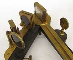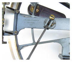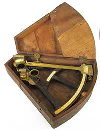 3.15 EARLY AMERICAN OCTANT BY IMPORTANT MAKERS. A fine Captain’s navigational instrument made by America’s foremost 19th century instrument makers “E. & G. W. Blunt, New York” as hand-engraved on the large arc. This especially beautiful all brass instrument bears a large inlaid silver arc calibrated in single degrees from -4 to 115, sub-divided by 20 arc minutes, marked in 10’s. The silver vernier scale on the index arm is calibrated from 0 to 20 arc minutes subdivided by 30 arc seconds, giving a theoretical accuracy of about ½ nautical mile at the equator. The index arm is provided with a pivoting magnifier for a precise reading. The cast solid brass frame supports the sight tube holder, index mirror, 4 index filters, horizon mirror and 3 horizon filters, all of which are without damage, complete and functional. The reverse of the instrument retains its lovely sculpted rosewood handle, mirror adjustment apparatus and 2 brass “feet.” It is fitted into its original keystone mahogany box bearing the partial label of the equally revered nautical instrument makers “THAXTER & SON, Boston.” This early style box is in remarkably well preserved condition, with none of the typical cracks, and is complete with both optics, 2 sun filters and adjusting wrench. The instrument measures 9 ¾ inches long on the index arm and 8 ½ inches wide on the large arc. The fitted box measures 11 inches tall by 11 inches wide. Seeing is believing. For the well versed collector, they really don’t come any nicer than this! SOLD The fact that the large arc is calibrated up to 115 degrees designates this instrument as an “octant” rather than a sextant, which would exhibit a scale of 130 degrees or more. |
