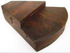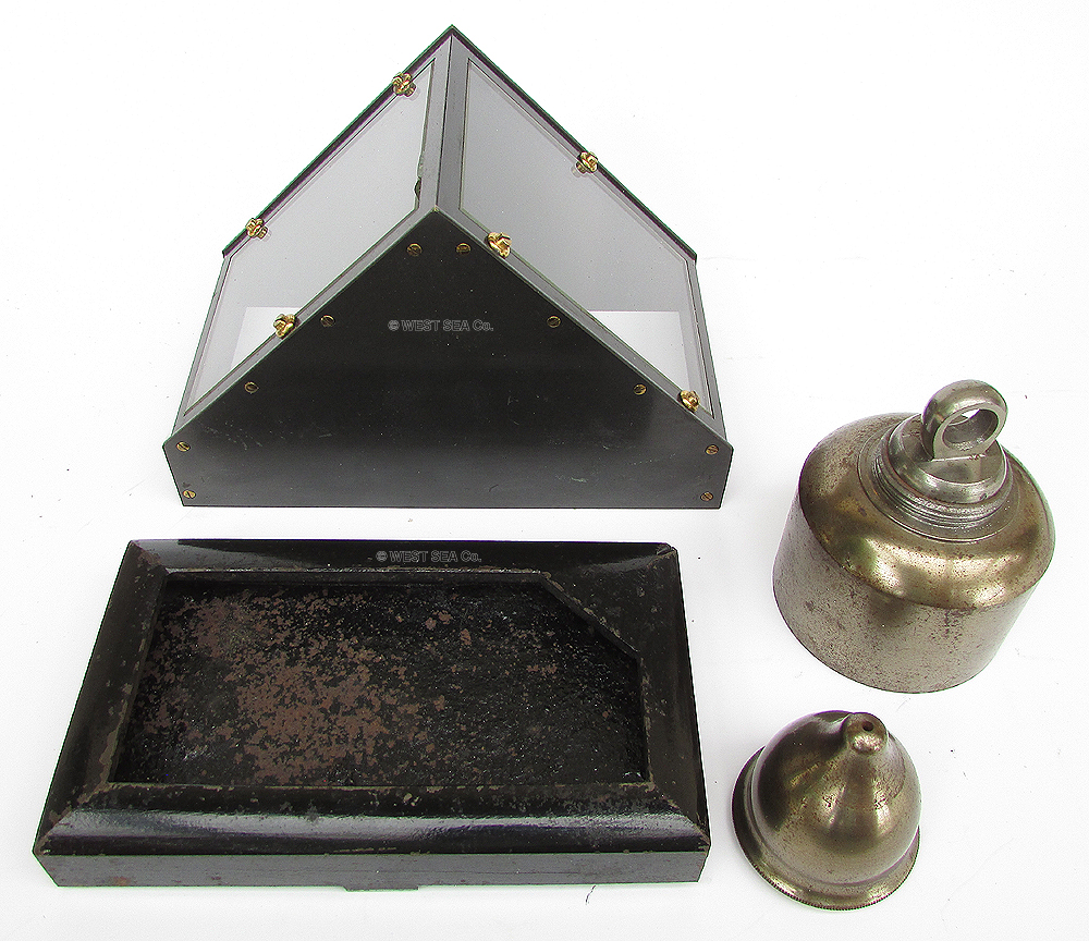 3.26 LOG TIMER. Authentic mid-19th century ship’s timer used in conjunction with a chip log to determine a ship’s speed and position using dead reckoning. Of significance, this navigational instrument was commercially-made. It consists of a hand blown glass vial with two bulbous section connected by a narrow neck in the middle. One of the bulbs contains a cloth plug by which iron filings were inserted. The glass is contained within two turned wooden discs supported by 4 simple wood columns. The discs are decoratively scribed with concentric circles and the end with the plug bears a paper label. The embossed lettering reads “28 SECONDS.” It is difficult to read but is legible under magnification. The timer measures 2 7/8 inches in diameter and stands 4 ½ inches tall. It is in working condition and surprisingly accurate. SOLD The exact origins of sand timers are unclear, although they are generally attributed to the Arab world. From ancient times the passage of water was used as a measurement of time in "water clocks." As a follow-on, the "fluid dynamics" of flowing sand was seen to be similar. "By the Middle Ages the sand-glass came into its own, fragile though it was, this was the first clock which the men who made the great voyages of discovery took with them." (Jean Randier, "Nautical Antiques for the Collector, 1977, Doubleday & Co., New York, page 96). "Dating old sand glasses can be difficult, but the color or tint of the bulbs is a help. The glass was greenish up to about 1700. During the 18th century it was darker; then in the 19th century it gradually acquired the transparency of crystal. There were also variations in the actual sand which, prior to about 1720, was reddish or orange-red in color. After about 1720, white or green sand was increasingly used." (Alan Major, "Marine Antiques," 1981, A.S. Barnes & Co., New York, pages 178-179.) Mariners have used the chip log for dead reckoning navigation since the first known description of the device in print. That was "A Regiment for the Sea" by William Bourne in 1574. Bourne devised a half-minute sand glass for timing. At that time, a mile was the equivalent of 5,000 feet. At a speed of one mile per hour a ship would travel about 42 feet in 30 seconds: Distance in feet = 1 mile/hour (3600 seconds) = 30 seconds x 5000 feet / 3600 seconds = 42 feet In early times the length of the log-line was measured directly by sailors as it passed through their hands. With the introduction of the nautical mile as a standard unit of measure at sea in the 15th century, they began to mark the line at equal intervals proportional to the nautical mile and to the time interval used for measurement. At first the markings were simply knots in the line. Later, sailors worked identifying knotted cords into the log-line. Most ships used knots spaced 7 fathoms (42 feet) apart. The time interval was therefore directly related to distance between knots in the line. Using 6,000 feet (or 2,000 yards) for 1 nautical mile, the above formula yields 28 seconds for a distance of 7 fathoms. With the advent of steam propulsion and faster ships in the first half of the 1800’s, the duration of the sand timer was cut to 14 seconds. |