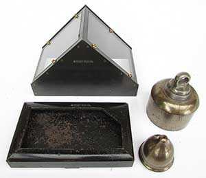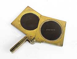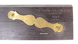 3.41 PARALLEL RULES. Delightful set of miniature parallel rulers used by the navigator of a WWI British warship. This diminutive pair is made with limbs of ebony and brass fittings. It is stamped by the famous makers “H. HUGHES & SON, LTD LONDON 1915” on one limb. Adding to its rarity and value is the fact that both brass arms bear the British broad arrow mark indicating it was used in the British Royal Navy. 6 inches long by 1 5/8 inches wide closed. Very early World War I. Perfect original condition. Sweet! 149 (See item 3.37) |
