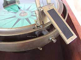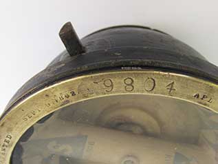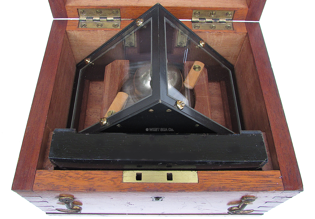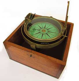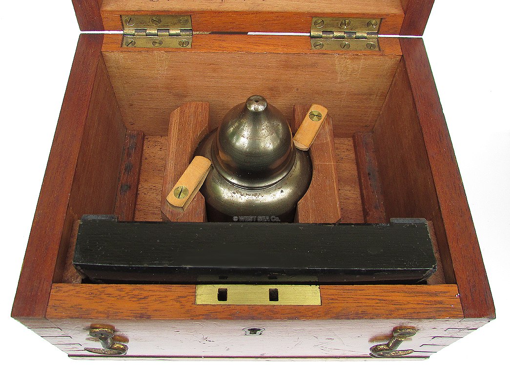 3.18 AZIMUTH INSTRUMENT. Genuine, highest quality ship’s navigational instrument made by the esteemed American makers, “NEGUS NEW YORK” as stamped on the bed plate and again on the maker’s tag on the box. This precision instrument is all brass with a blackened finish. It has an optical quality glass prism which rotates via two knurled brass knobs. Designed to be set atop the ship’s main steering compass in a binnacle, it has a magnifier set in a tube below the prism to enhance the current compass reading while at the same time providing an image of the sun or celestial body. Two pivoting sun shades are provided for looking at the former. A removable “line-of-sight” pole is provided, as is a bubble level for assuring totally accurate level readings. This instrument fits the top of a standard size 8 inch Navy magnetic compass. It measures 9 ¼ inches long by 3 3/8 inches wide and 8 ¾ inches high with the removable vertical post. Absolutely mint, untouched, original factory condition in its original dove-tailed wooden box with brass hardware measuring 10 1/4 by 7 ½ inches by 5 ½ inches thick. 199 |
