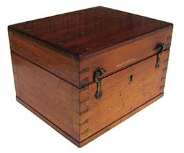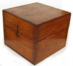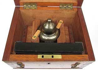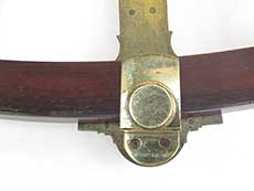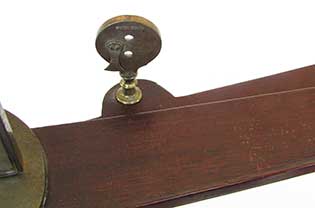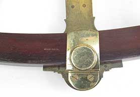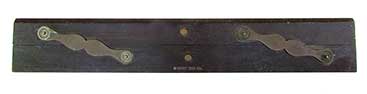 3.42 NAVIGATOR’s RULES. A very nice example of late 19th century rolling parallel rules made by the well-known English maker “J.A. Nicholl & Co.” as impressed in the top of the rule. This substantial, highly accurate navigational instrument is made of brass with a boxwood body. It consists of a heavy brass axel connected to knurled rollers on each end. These move freely allowing the rules to run over the face of a chart parallel to the course line. To assist the navigator in plotting, knurled brass knobs are provided on each end of the rules. This precision device is housed in its high quality mahogany box with machine dovetailing and interior felt supports. Two brass hook and eye closures insure the contents are secure. The rules measure 18 inches long by 2 ½ inches wide. Unlike trapezoidal parallel rulers, the extent of this ruler’s travel is endless. The box measures 19 inches long by 3 ¼ inches wide and 1 7/8 inches thick. Outstanding original condition in all respects. 249 |